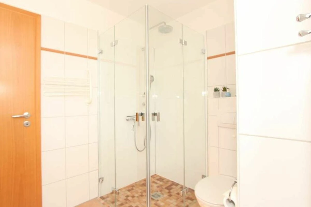 Das moderne Badezimmer ist mit einer ebenerdigen Dusche und WC ausgestattet. Ein Fenster spendet zusätzlich Tageslicht und erleichtert das Lüften nach dem Duschen.