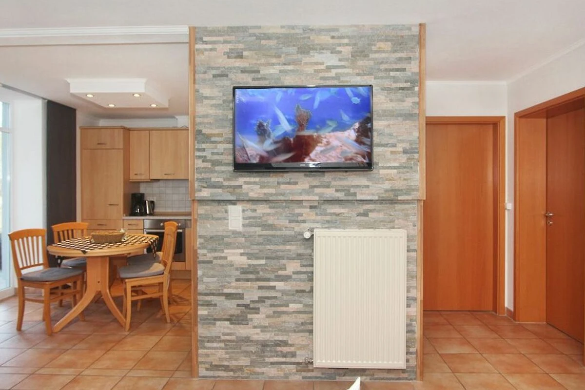 Der Wohnbereich der Ferienwohnung wird von der bequemen Sofalandschaft dominiert. Für die Unterhaltung stehen Ihnen im Wohnzimmer Flatscreen-TV, DVD-Player und Stereoanlage zur Verfügung. Die Couch im Wohnbereich kann zu einer Schlafgelegenheit für eine weitere Person umgewandelt werden.