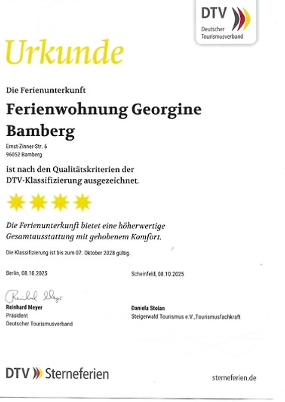 «Ferienwohnung Georgine Bamberg» erreicht eine Urlauberbewertung von 5 (Bewertungsskala: 1 bis 5) bei 10 abgegebenen Bewertungen.
