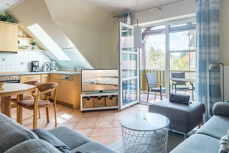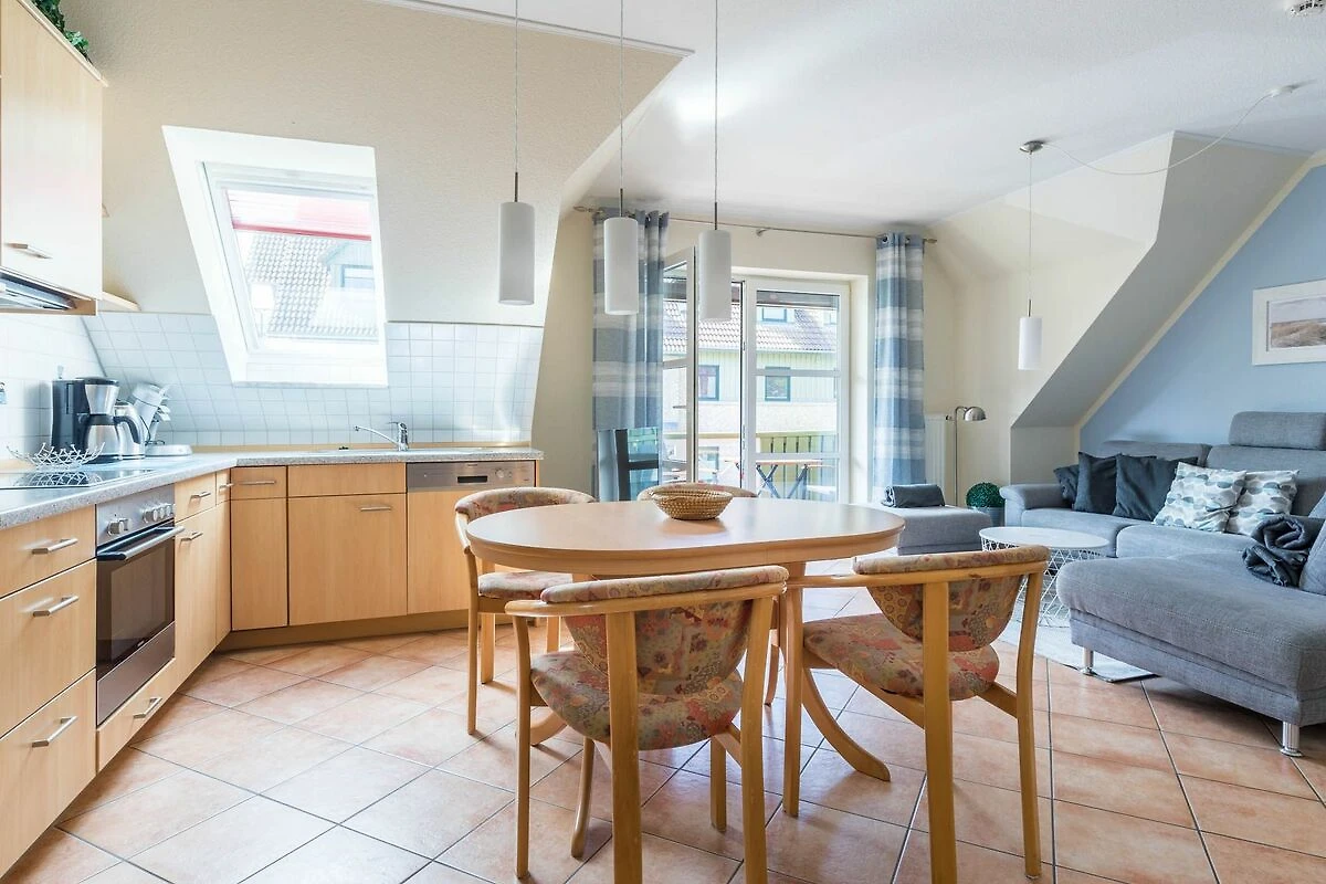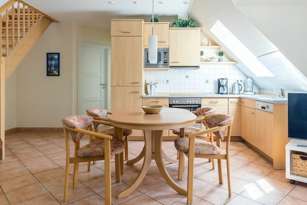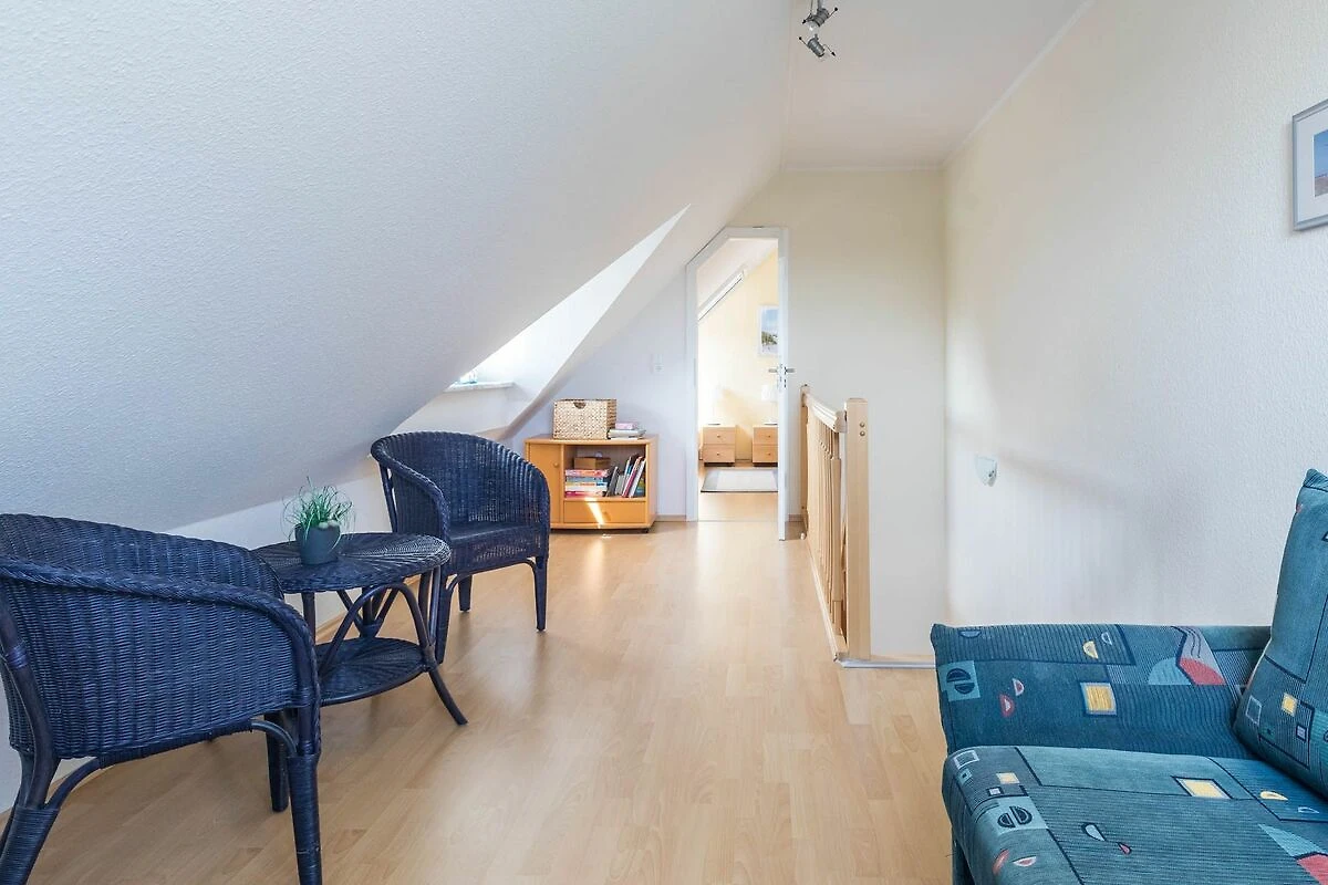 Eine 3-Zimmer-Ferienwohnung über zwei Ebenen mit offener Wohnküche, WLAN und gemütlicher Leseecke auf der Galerie