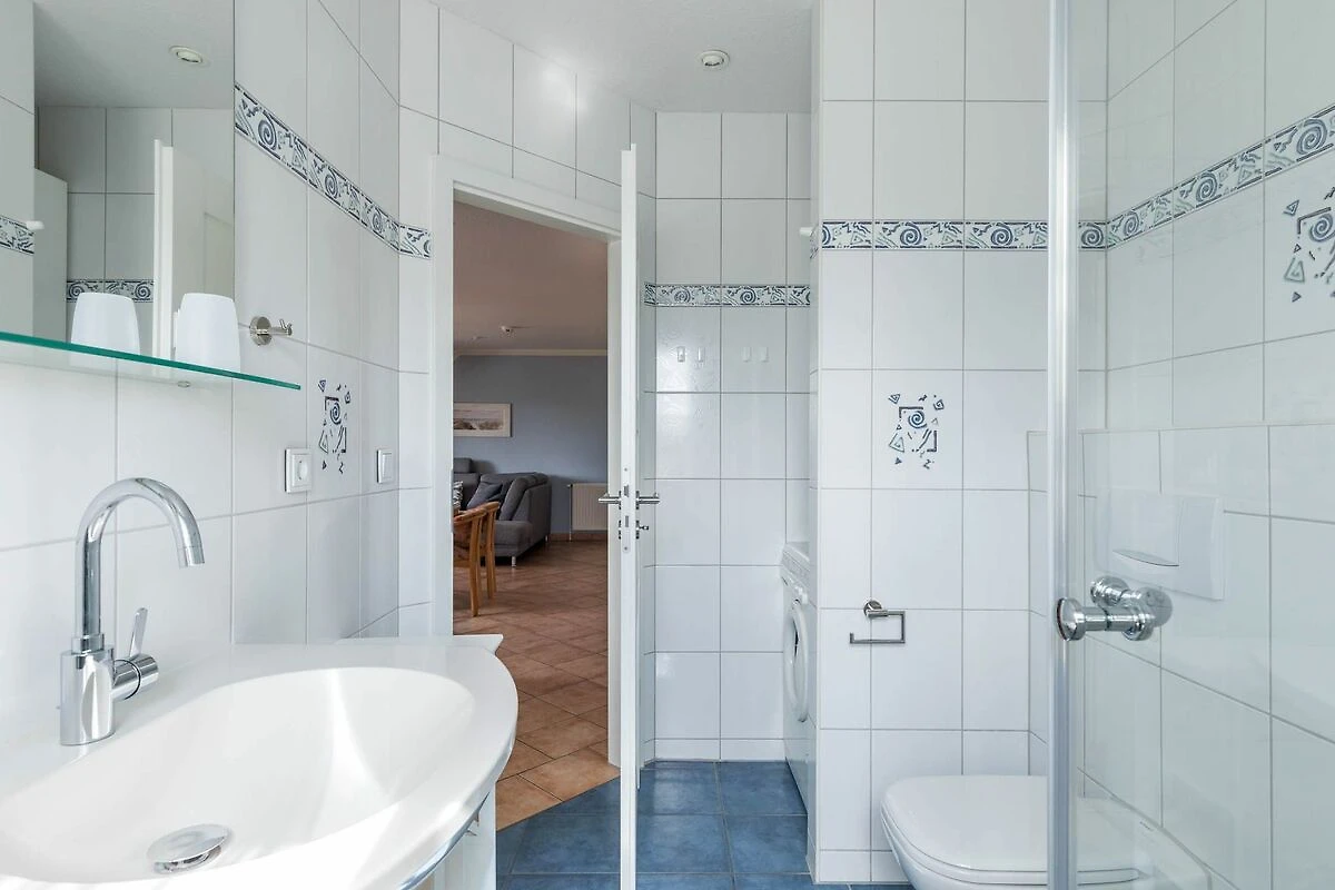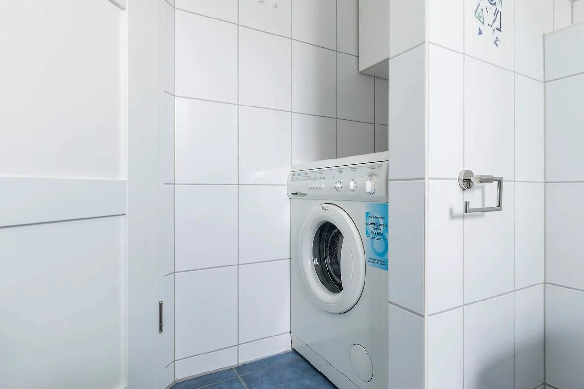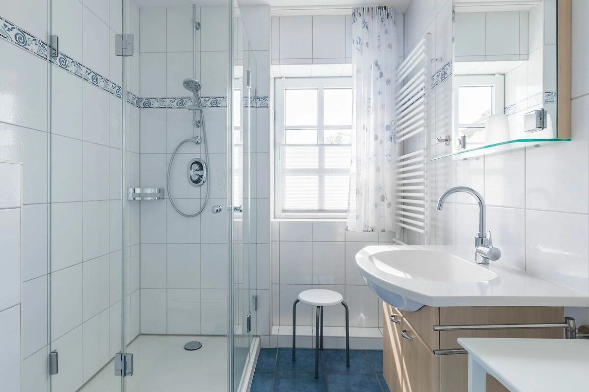 Ein Bad mit Dusche und WC vervollständigt die Ferienwohnung auf dieser Etage. Fenster, Fussbodenheizung und eine gebührenfreie Waschmaschine finden Sie im Badezimmer ebenfalls vor.