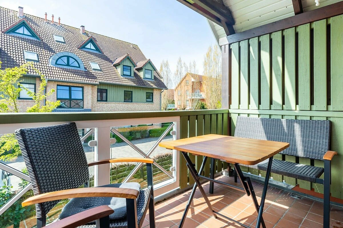 Der möblierte Südwest-Balkon lädt zu einem Frühstück im Freien ein. Er ist bequem vom Wohnzimmer erreichbar.