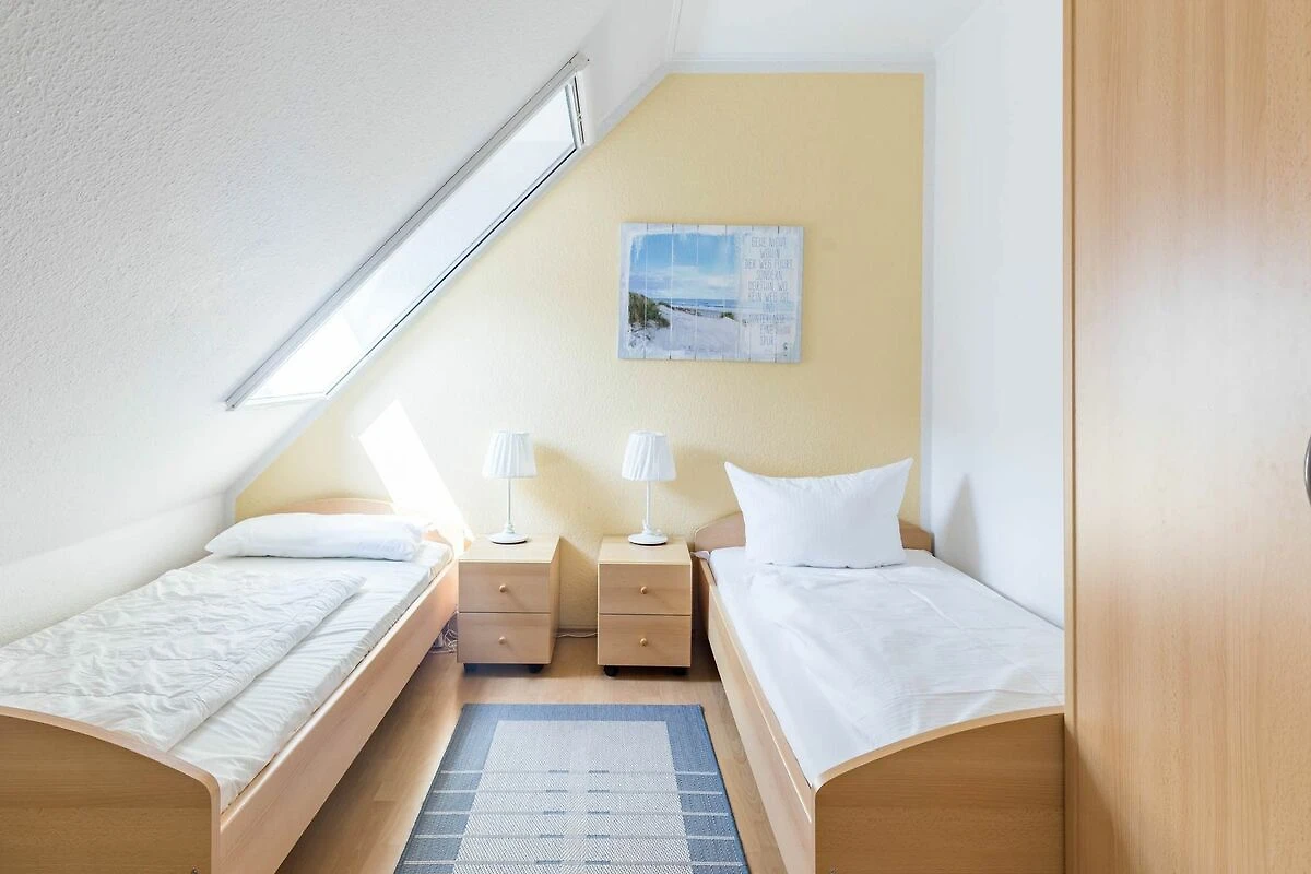Diese allergikerfreundliche Nichtraucher-Wohnung ist gut geeignet für alle strandverliebten Urlauber, welche gern auf kürzestem Wege zur Ostsee gelangen möchten und eine ruhige Wohnlage in gepflegtem Gartenambiente, nicht weit vom Zentrum entfernt bevorzugen. Im Schlafzimmer und im Badezimmer in der unteren Wohnebene befinden sich Fliegenschutzgitter an den Fenstern. Im Wohn- und Essbereich sorgt die Fussbodenheizung für ein gutes Raumklima. Im grossen Schlafzimmer ist im Fenster ein Fliegenschutzgitter vorhanden. Die Schlafzimmer können mittels Rollos abgedunkelt werden.
