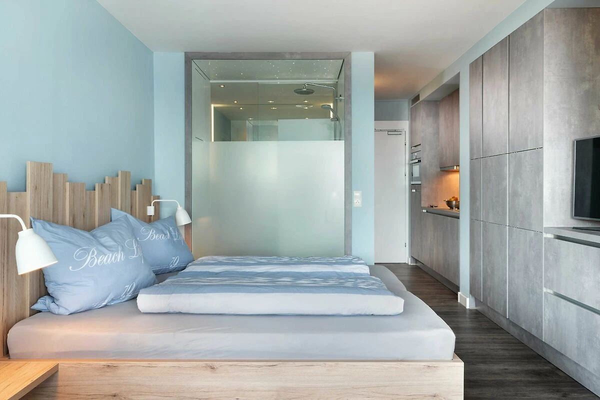 Für Gäste, die auf einen Rollstuhl angewiesen sind, ist der Eingang zum Bad zu schmal. Ansonsten ist alles im Appartment ebenerdig.