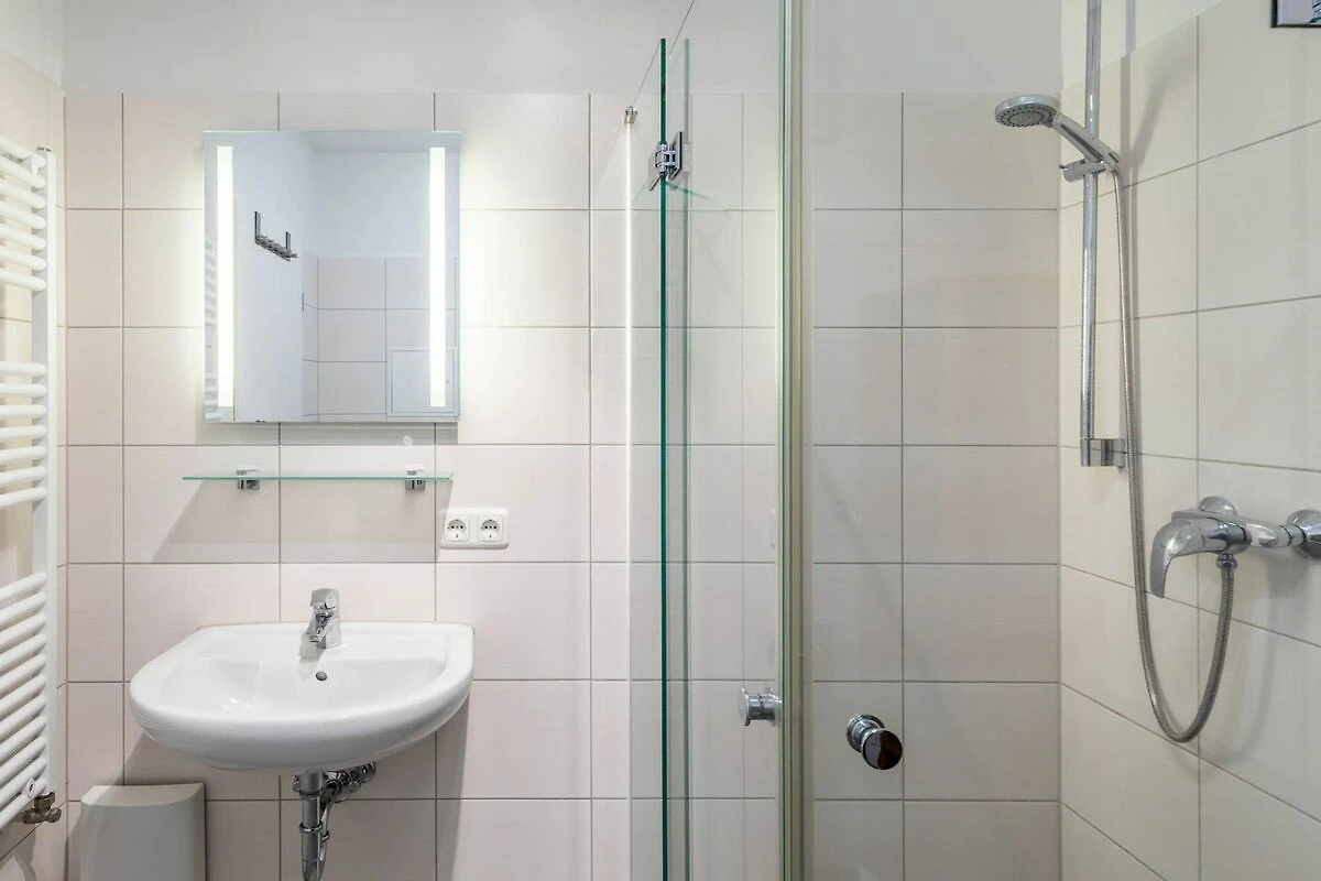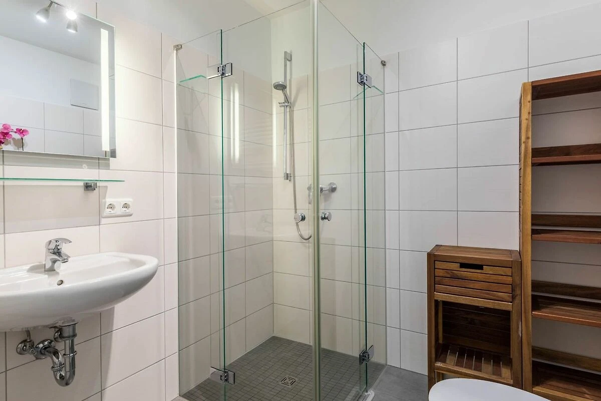 Die Dusche im Bad ist ebenerdig. Es gibt einen Waschtisch und einen Handtuchheizkörper.