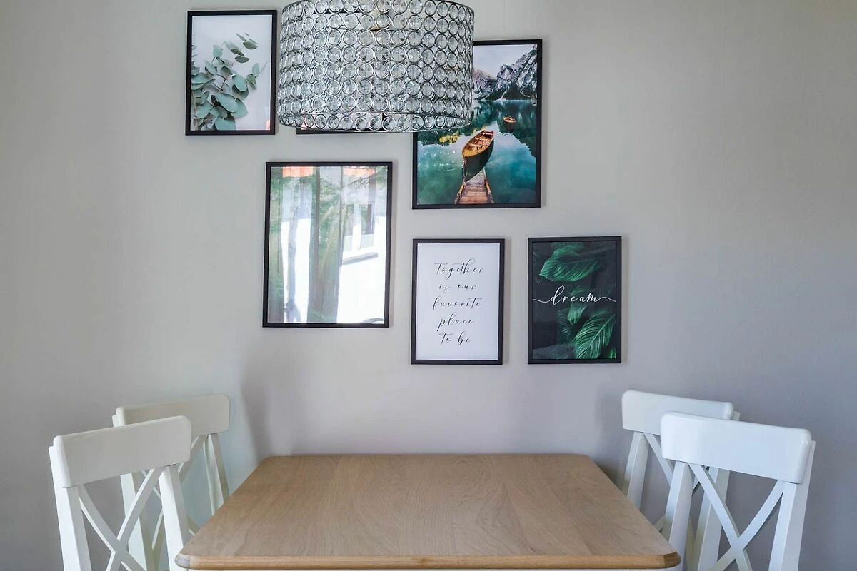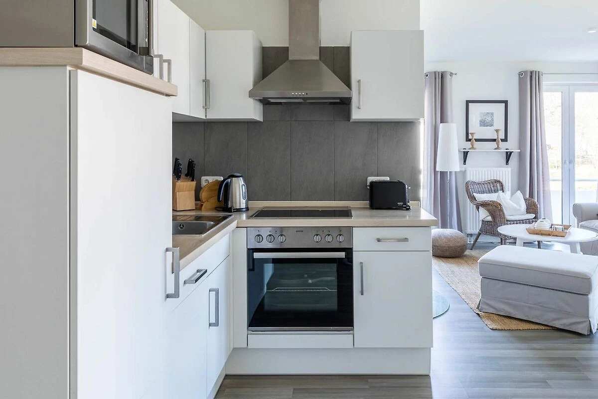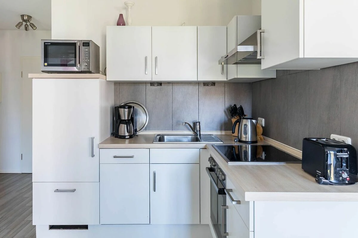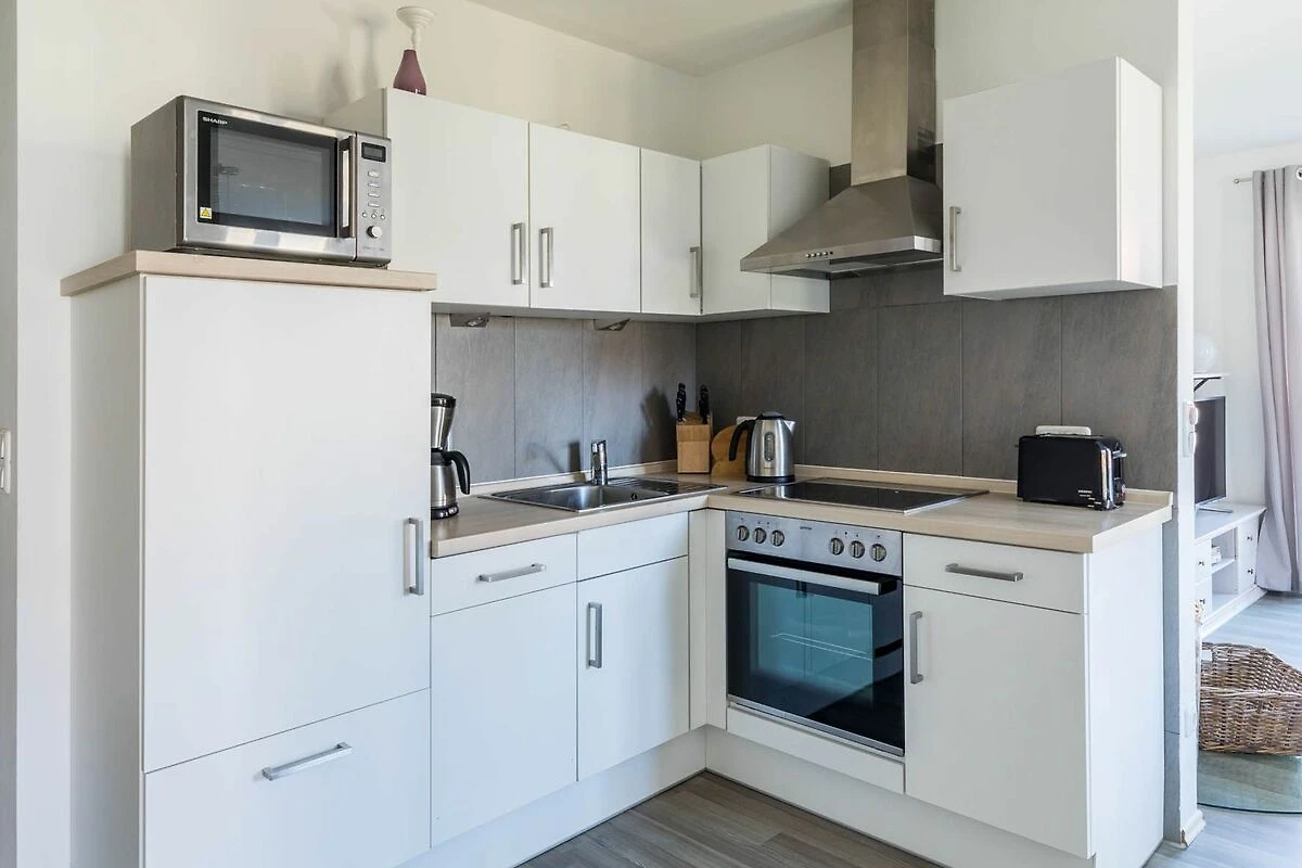 Die moderne Wohnung hat eine Einbauküche, die durch Herd, Backofen, Kühlschrank mit Gefrierfach und vielen weiteren Geräten komplett ausgestattet ist. Für ein behagliches Frühstück sorgen in der Küche unter anderem Wasserkocher, Toaster und Kaffeemaschine. Natürlich ist ausreichend Geschirr und Besteck für vier Gäste vorhanden.
