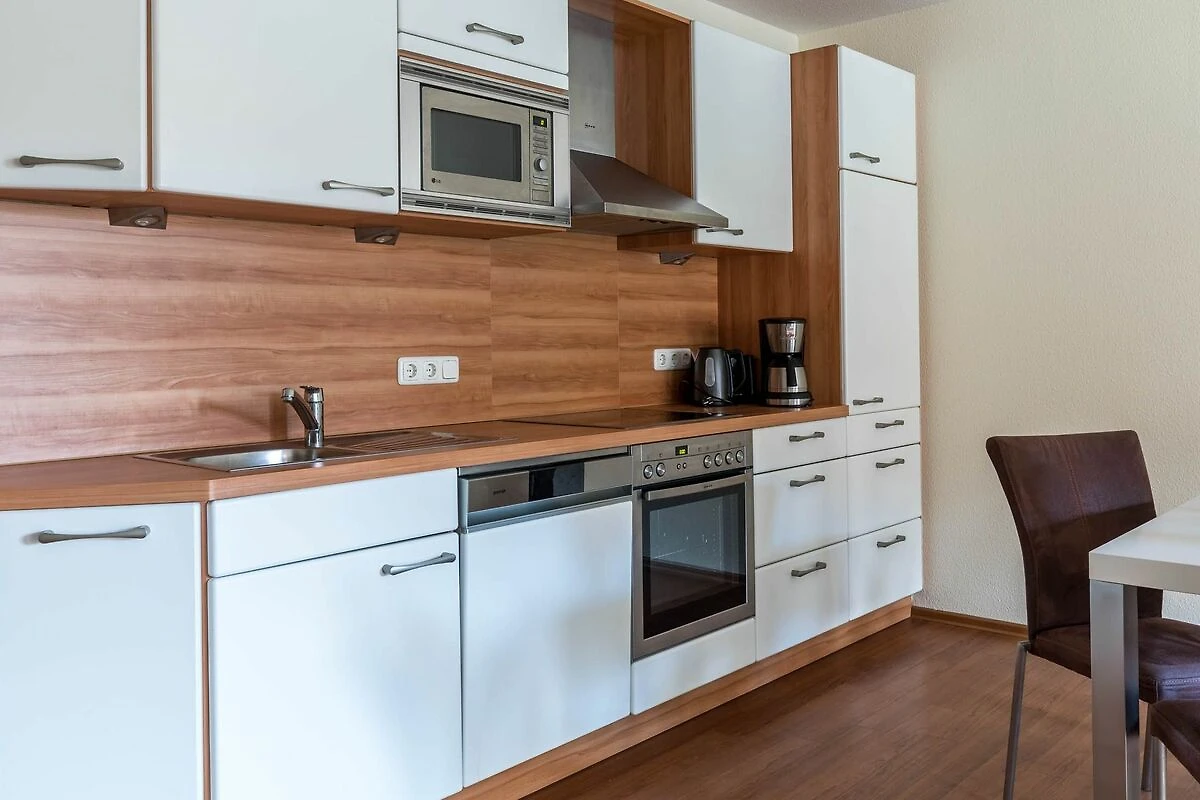 Auch die komfortabel ausgestattete Küchenzeile mit ihrer gemütlichen Essecke lässt keine Wünsche offen. Sämtliche Geräte wie z.B. Backofen, Herd mit Ceranfeld, Kühlschrank mit Gefrierfach, Geschirrspüler, Mikrowelle uvm. helfen bei einer rundum sorglosen Selbstverpflegung.