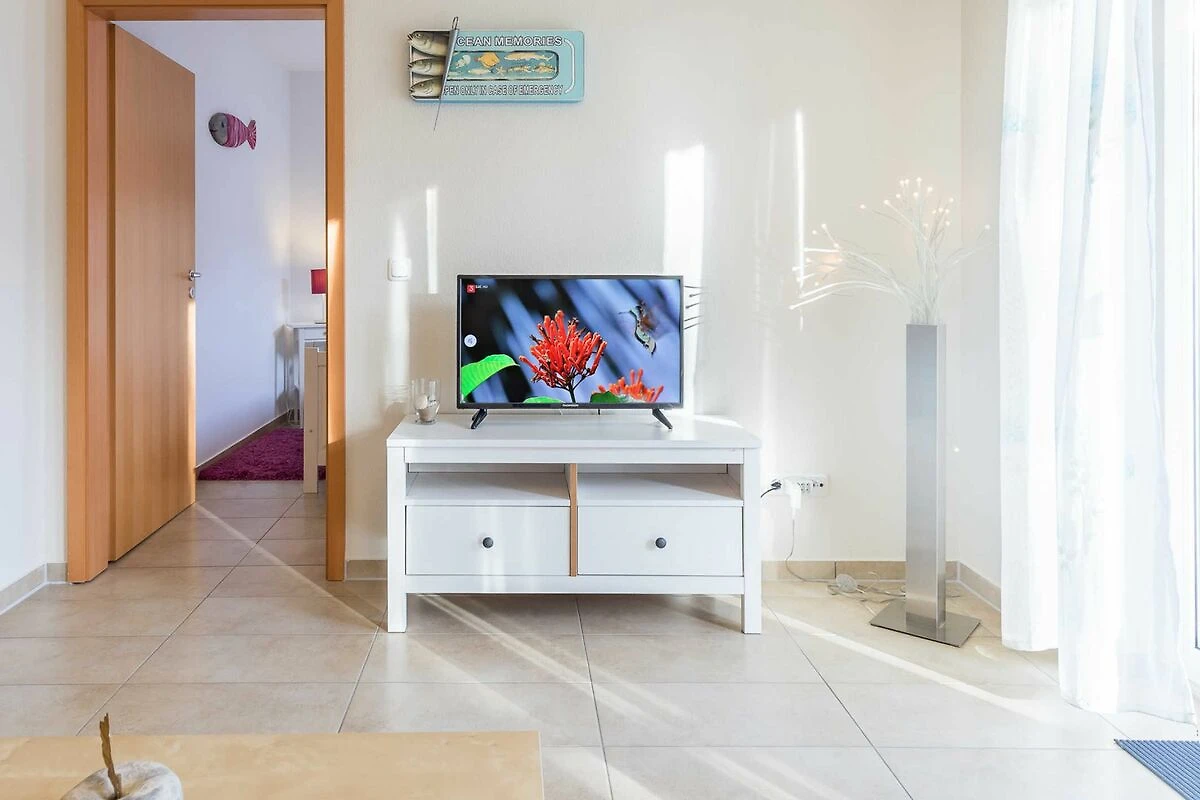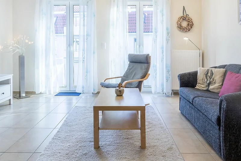 Das besteht aus einem Sofa mit Leselampe, zwei Sesseln, einem Couchtisch zum Füsse hochlegen oder gemeinsamen Spielen, einer Stereoanlage mit Radio, CD Player und USB-Anschluss, einem Flatscreen-Fernseher und unverzichtbar im Urlaub! einem Bücherregal mit über 100 Büchern. Was immer Sie gern lesen, ob anspruchsvolle Literatur, Sachbücher, Krimi oder Kochbücher: Hier werden Sie fündig. Und wenn das Buch bis zum Urlaubsende nicht ausgelesen ist: kein Problem wenn Sie dafür ein anderes dalassen, dürfen Sies gern mitnehmen. Das Sofa ist ausziehbar und bietet Platz für zwei weitere Gäste (Liegemasse ausgezogen 130x200cm). Die beiden hohen Fenstertüren, durch die Sie auf den Balkon treten, lassen viel Licht und Seeluft herein: Bei entsprechendem Wetter ist die ganze Wohnung sonnendurchflutet.