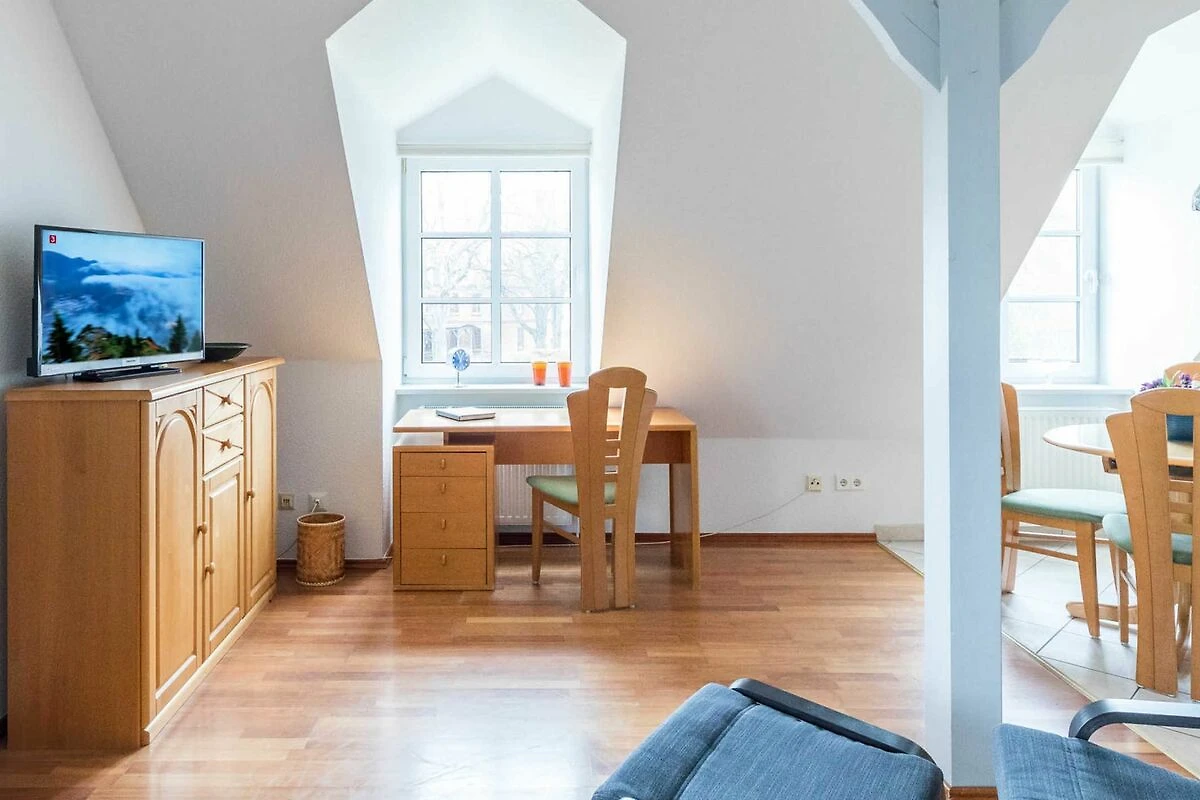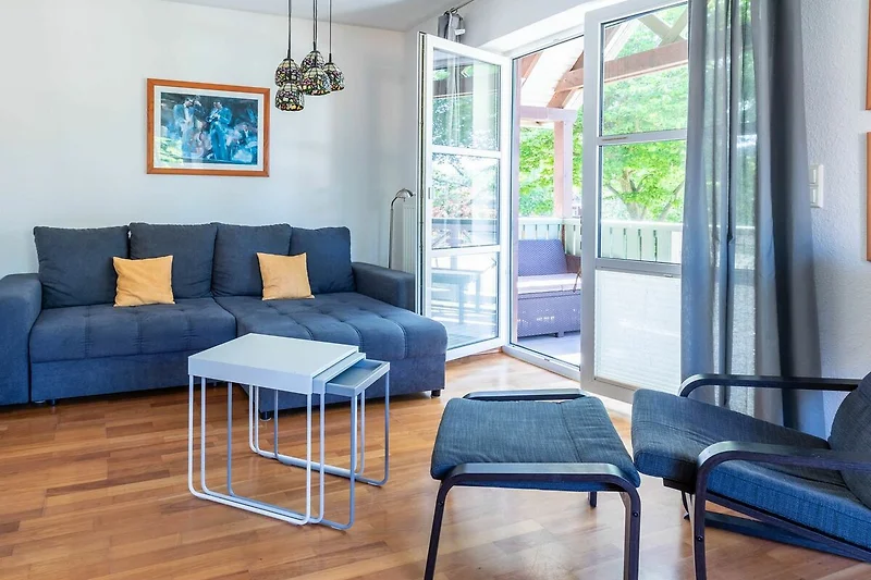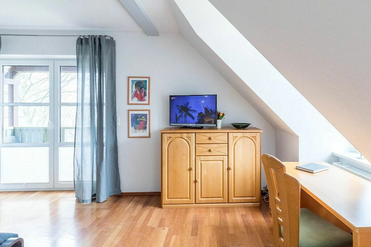 Mittelpunkt der Wohnung ist im unteren Bereich der Wohn- und Essbereich, im Winter sogar mit Meerblick durch die laubfreien Bäume. Zur Ausstattung dieses Raumes gehören ein bequemes Sofa, ein Sessel mi passendem Hocker sowie ein TV- und ein CD-Radio-Gerät. Das Sofa kann bei Bedarf ausgeklappt werden und so entstehen zwei zusätzliche Schlafplätze (140x200cm).