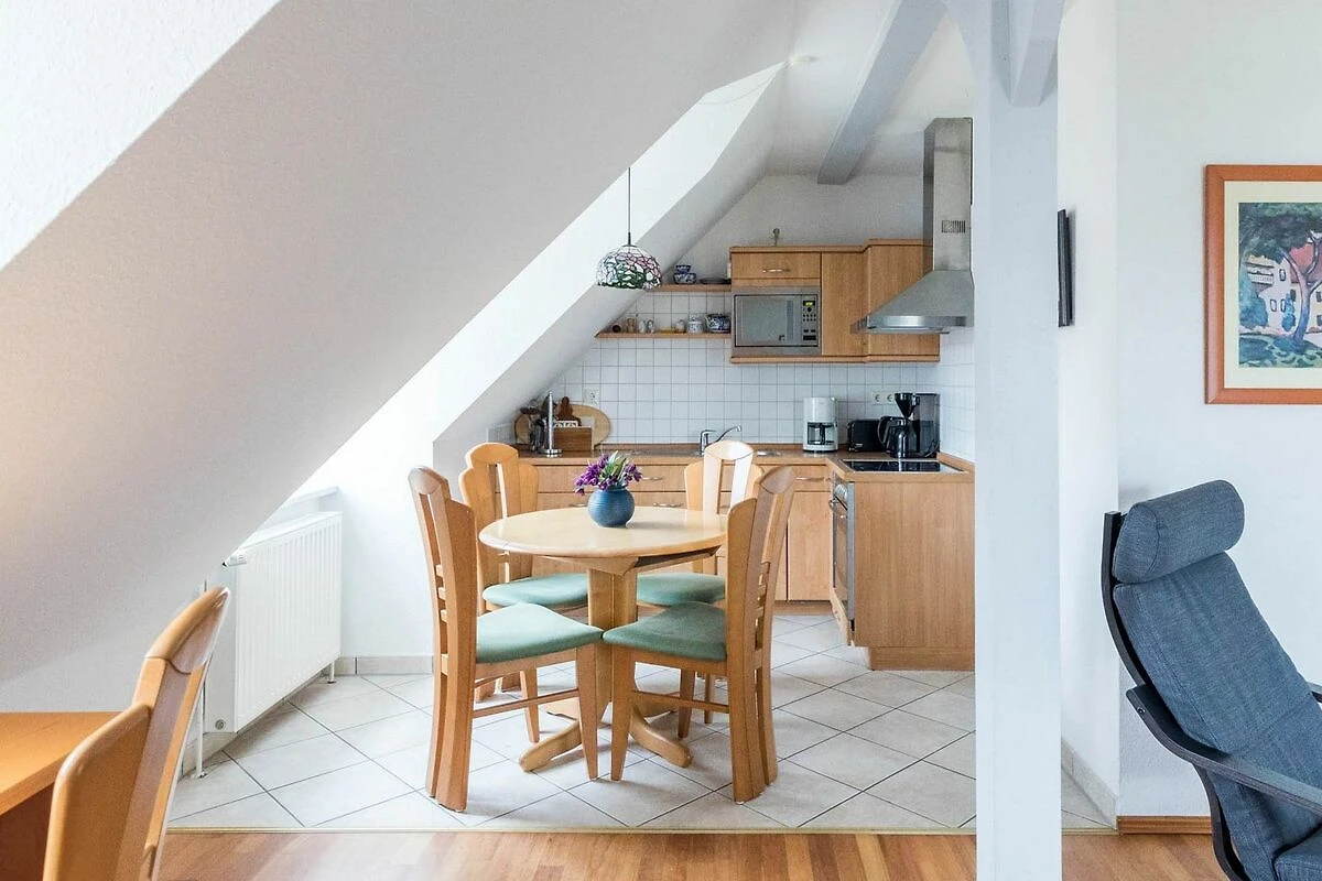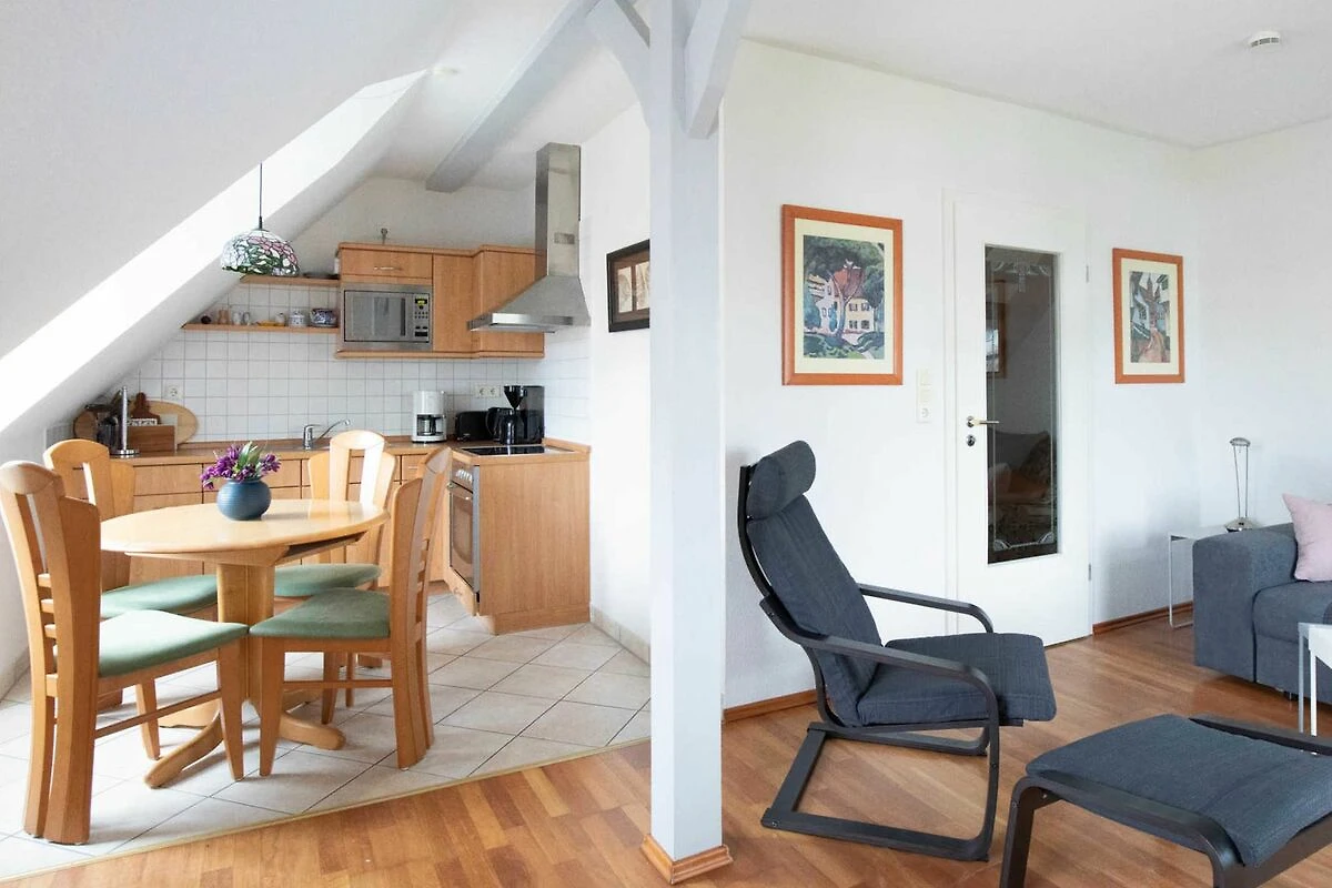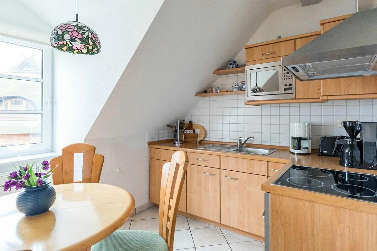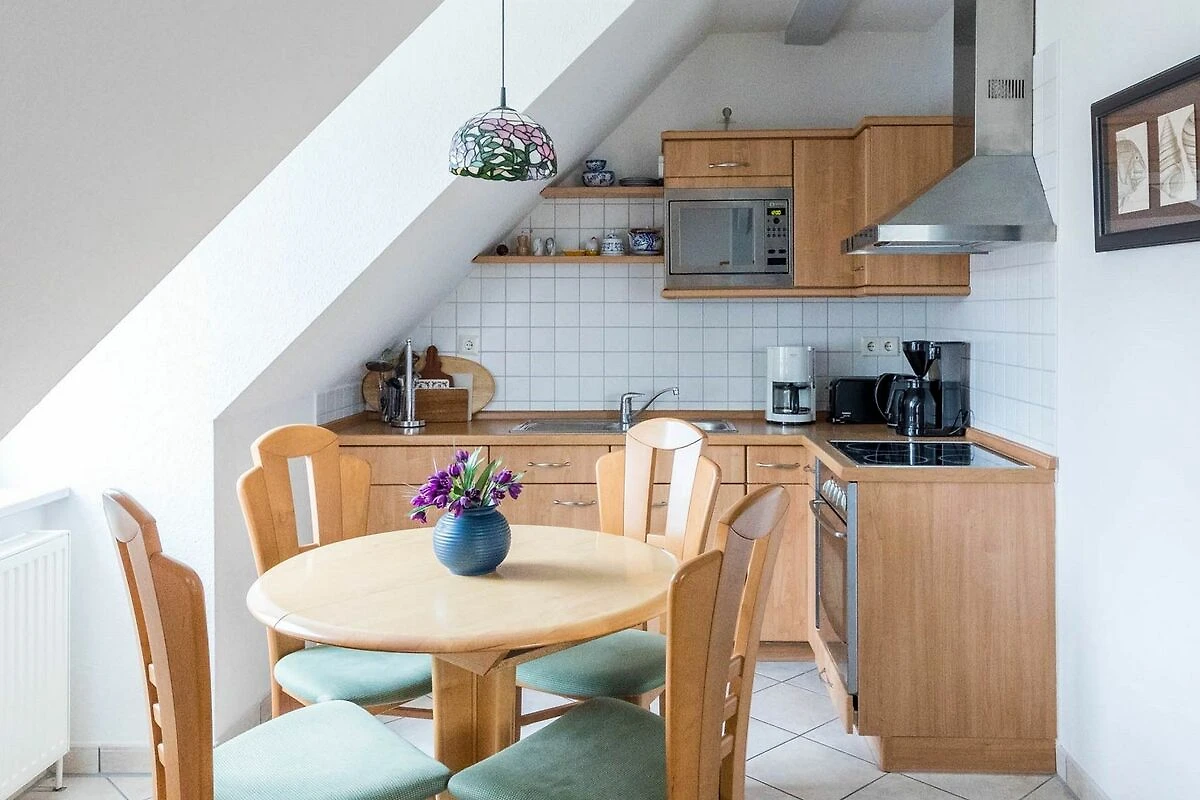Die räumlich abgeteilte, aber offene Küche verfügt über einen Backofen, ein Cerankochfeld, eine Mikrowelle sowie über eine Kaffeemaschine. Es Esstisch mit Fenster können Sie bequem sitzen.