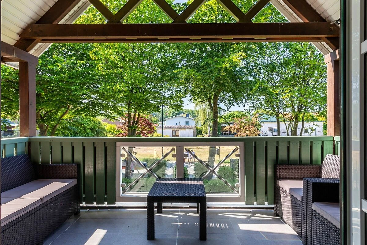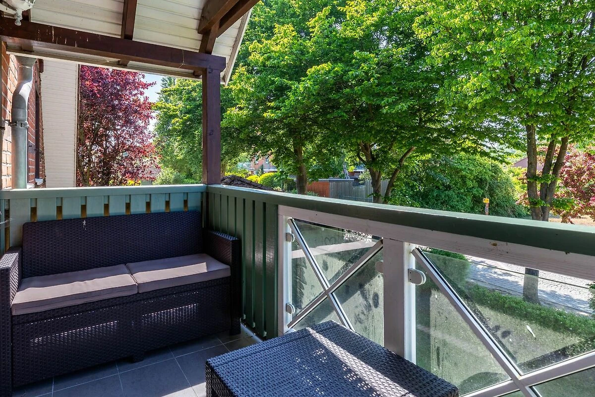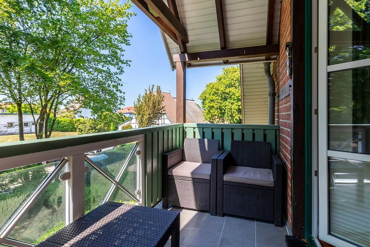 Vom Wohnbereich betreten Sie den möblierten Nordwest-Balkon, auf dem die frische Ostseeluft und der Blick im Winter aufs Meer durch die Bäume genossen werden können.