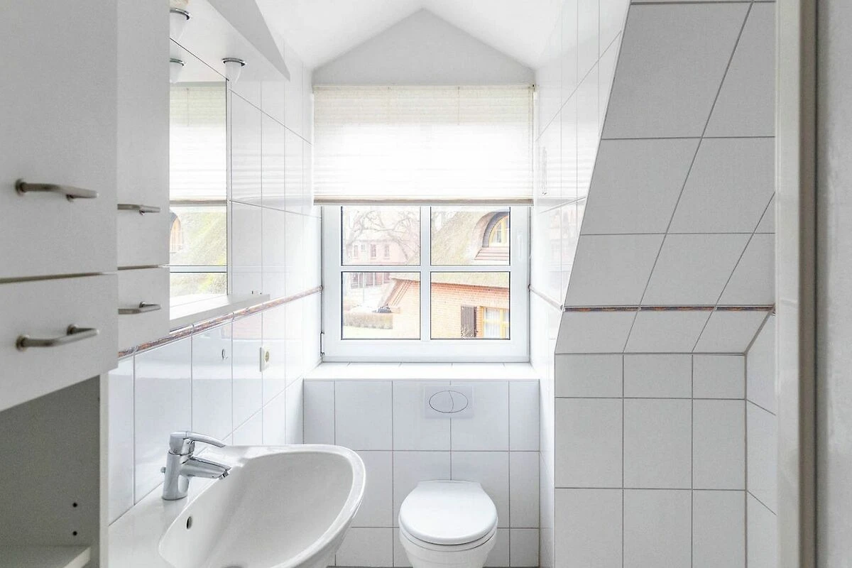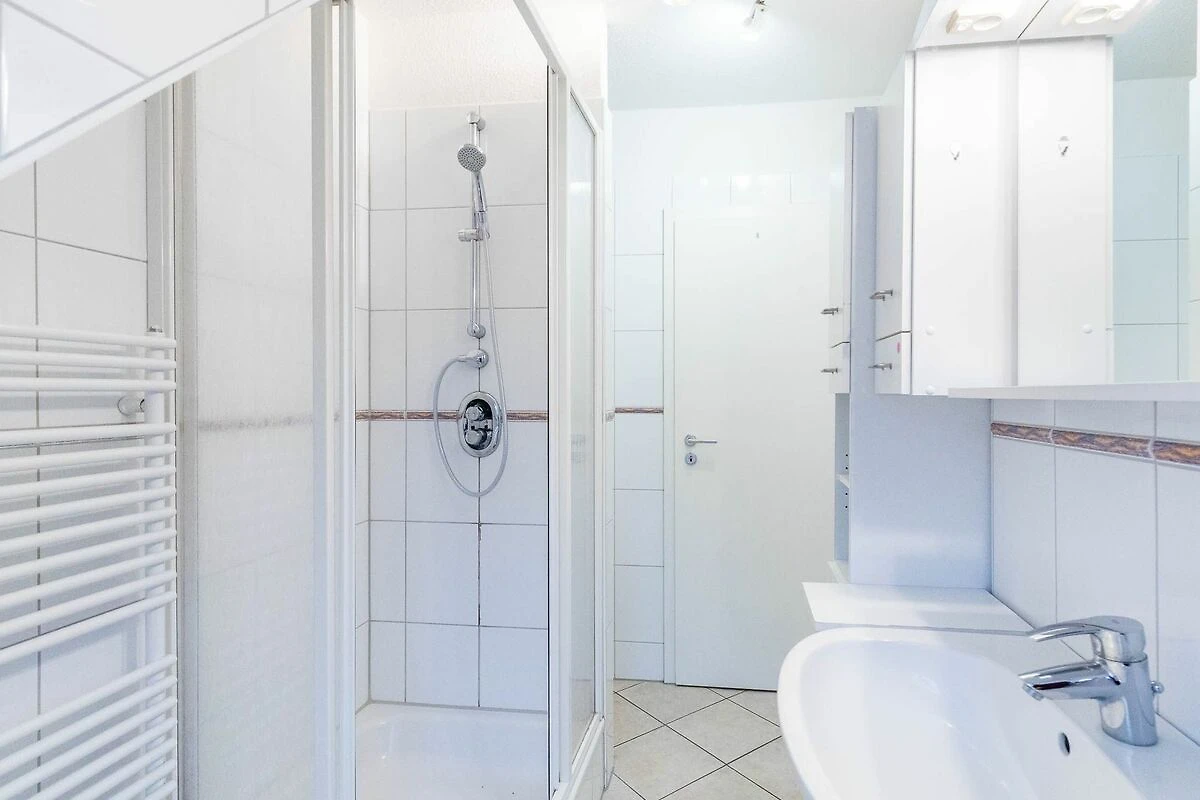 Im Bad mit Fenster findet man eine Dusche (Einstiegshöhe 30cm), einen Waschtisch, ein WC und einen praktischen Handtuchtrockner.