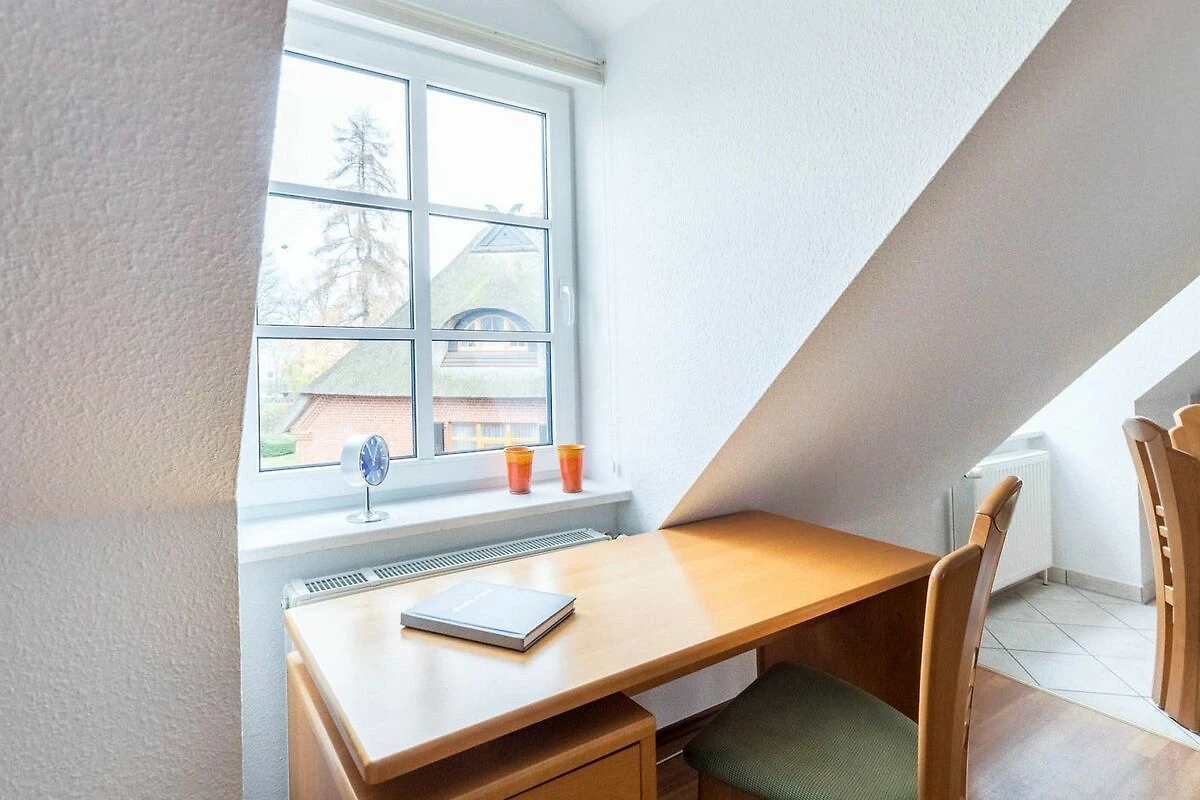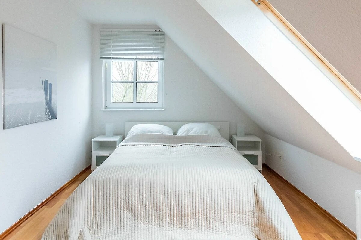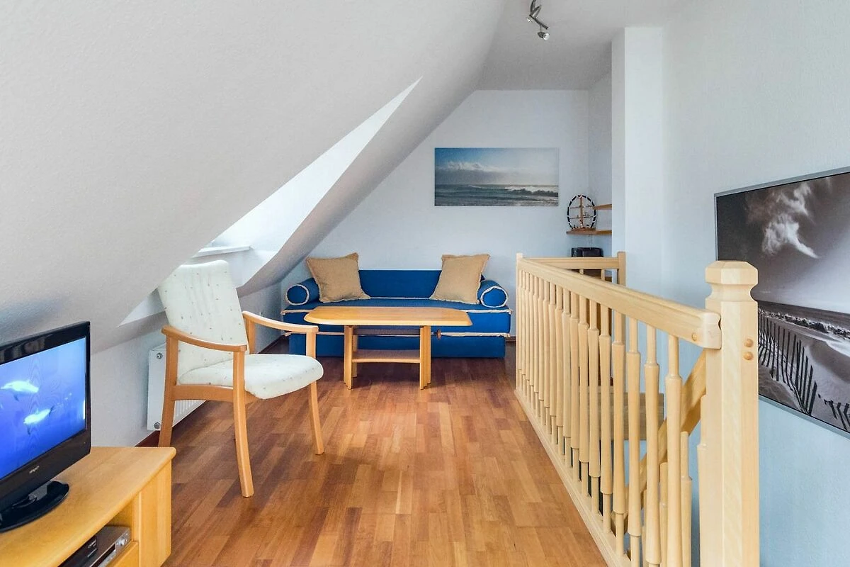 In der 2. Wohnebene, im Dachgeschoss befinden sich die offene Schlafgalerie mit einem Doppelbett (160x200cm, getrennte Matratzen, Lattenroste am Kopf verstellbar), eine Kommode sowie eine gemütliche Leseecke, die mit SAT-TV und DVD-Player ausgestattet ist. Das Schlafzimmer lässt sich mit einem Rollo abdunkeln. Das Schlafsofa bietet eine weitere Option zum Nächtigen (Liegefläche 80x200cm).