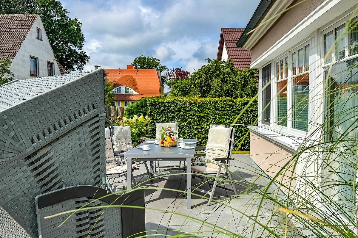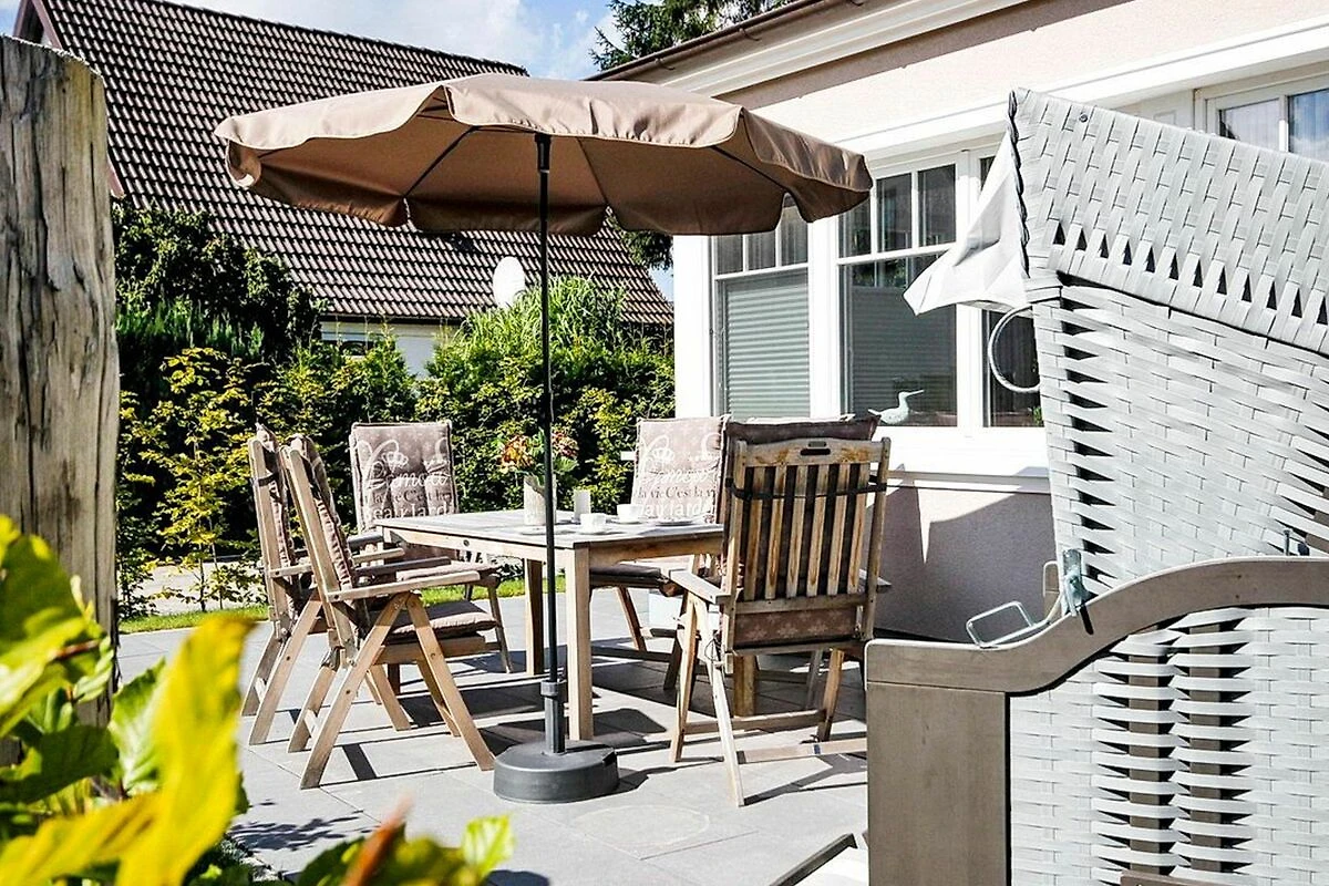 • Terrasse mit eigenem Strandkorb und liebevoll angelegtem Garten