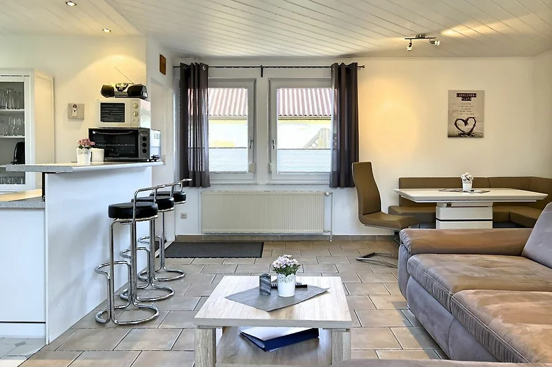 • Viel Komfort: Voll ausgestattete Wohnküche, gemütlicher Wohnbereich und sonnige Terrasse.