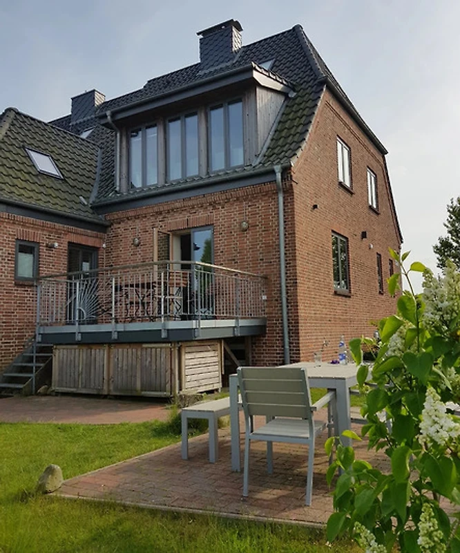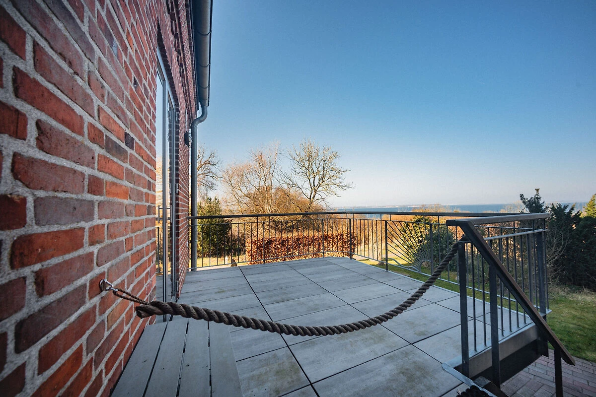 Direkt an die Wohnung grenzen 2 großzügige Terrassen mit edlen Holzmöbeln. Die große hintere Terrasse bietet Ihnen einen tollen Panoramablick auf die gegenüberliegende Dänische Küste und die vordere Terrasse grenzt an einen kleinen privaten Garten, der ungestörte Sonnenbäder erlaubt. Sonnenliegen, Sonnenschirm, Auflagen und ein Grill sind vorhanden.