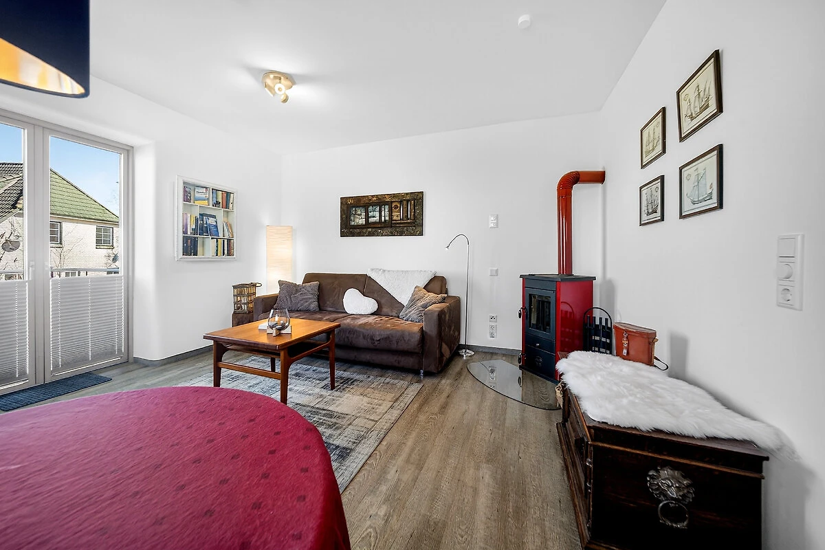 Die Erdgeschosswohnung „Gendarmenstube“ mit einer Nutzfläche von über 65 qm wird Sie bereits beim Eintreten durch die exklusive und gemütliche Einrichtung begeistern. Die offene Küche ist mit dem Wohnbereich verbunden. Im Wohnzimmer erwarten Sie ein großes und bequemes Bettsofa (160x200) sowie ein Kaminofen und ein schöner Esstisch mit bequemen Sesselstühlen für gemütliche Stunden. Aus den bodentiefen Fenstern können Sie zu jeder Tageszeit den fantastischen Blick über die Flensburger Förde nach Dänemark hinüber genießen. Das Bad ist für Ihren Komfort mit einer bodenebenen Dusche ausgestattet. Das Doppelbett im großen, gemütlichen Schlafzimmer ist 180x200 groß.