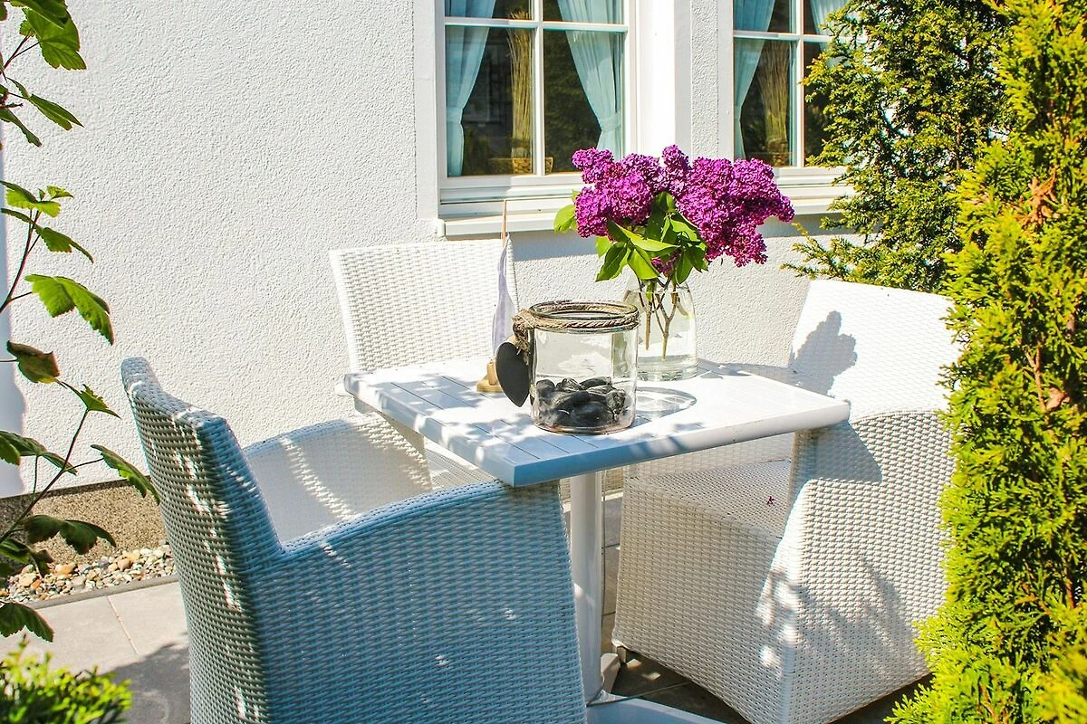 Auf der Hofseite erwartet Sie eine kleine Grillecke mit Teakmöbeln , Sonnenschirm und Strandkorb für gemütliche Grillabende.
