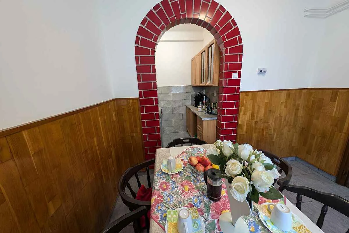 1. Etage: Küche mit Essecke (6 Plätze), Gasherd (4 Flammen), Backofen, Kühlschrank (Eisfach), Mikrowelle, Kaffeemaschine und elektrischem Wasserkocher.