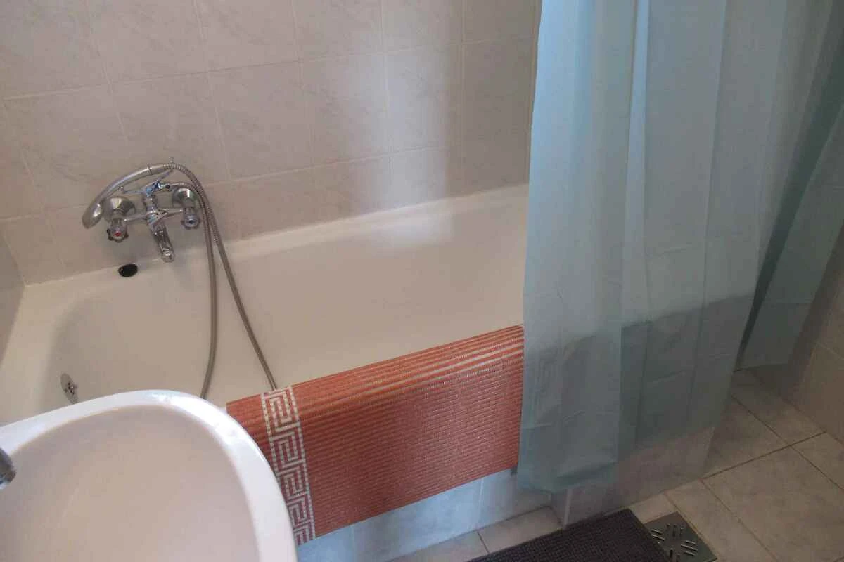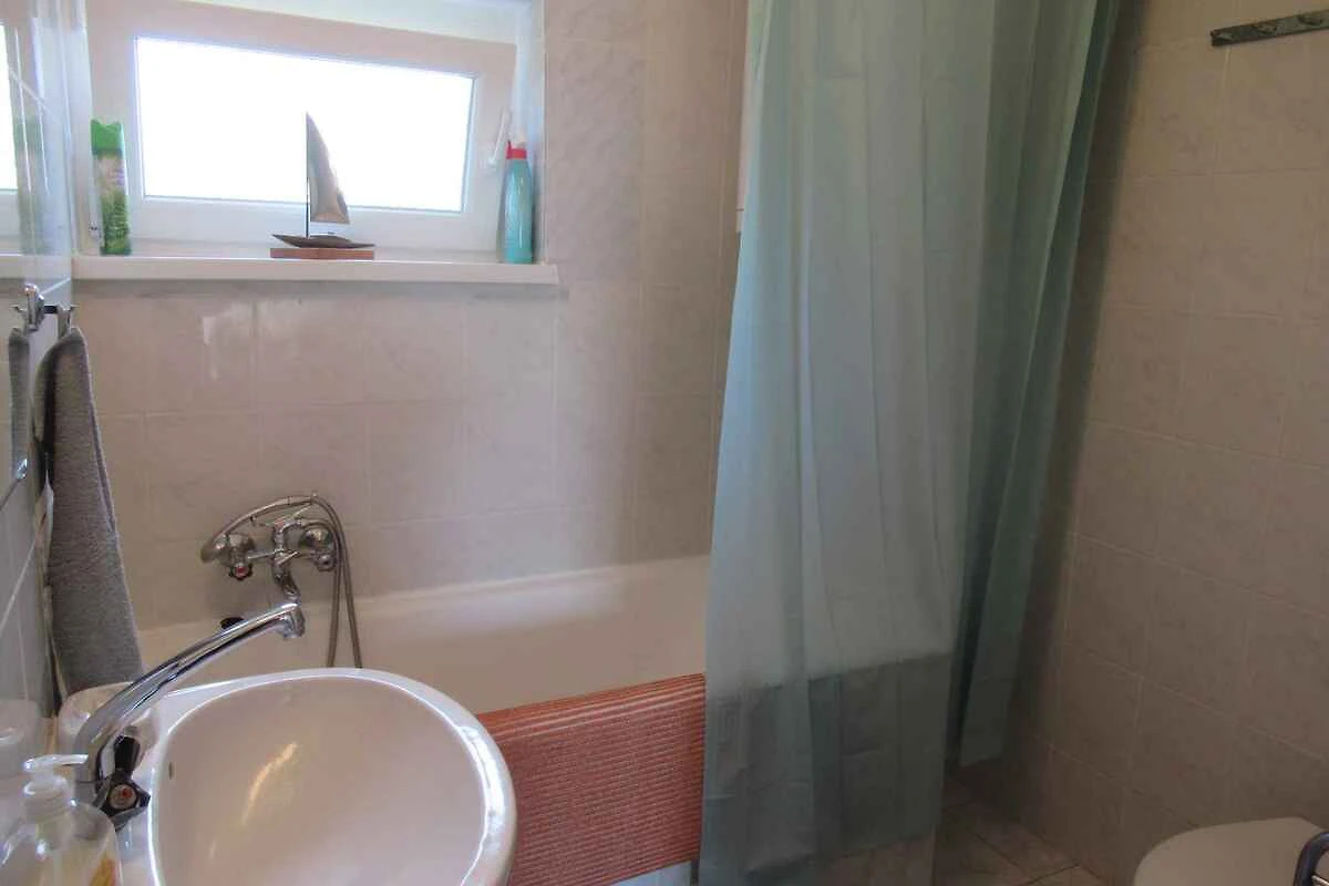 Obergeschoss: Schlafzimmer (12 qm, Durchgangszimmer) mit 2 Einzelbetten und Zugang zum Balkon (12 qm, Gartenmöbel, 1 Tisch, 2 Stühle). Schlafzimmer (12 qm, Durchgangszimmer) mit 2 Einzelbetten und Zugang zum Balkon Zugang zur Loggia (Gartenmöbel). Bad (4 qm) mit Badewanne, 1 Waschbecken, WC und Fenster.
