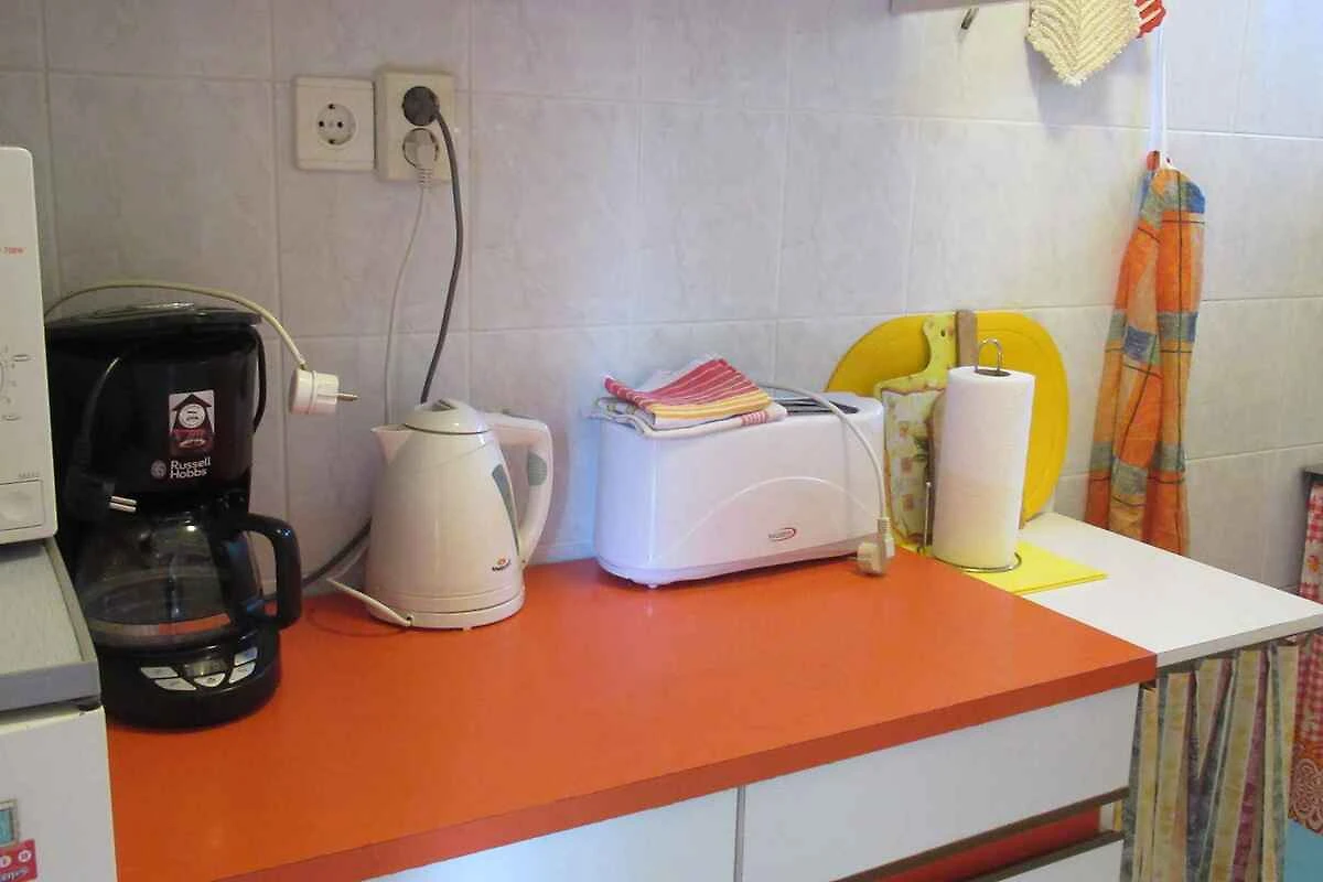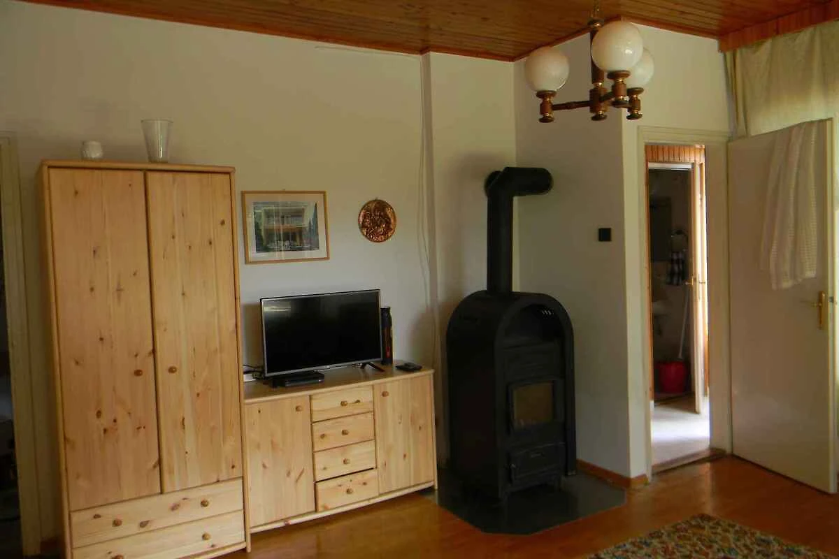 Erdgeschoss: Wohnzimmer (20 qm) mit auf Couch/Sofa, TV, Kamin und Zugang zur Terrasse (Gartenmöbel, Sonnenschirm). Schlafzimmer (12 qm) mit 2 Einzelbetten und Zugang zum Balkon. Küche (6 qm) mit (6 Plätze), Gasherd (2 Flammen), Kühlschrank (100 l), Mikrowelle und Kaffeemaschine. Bad (3 qm) mit Dusche, 1 Waschbecken und WC.