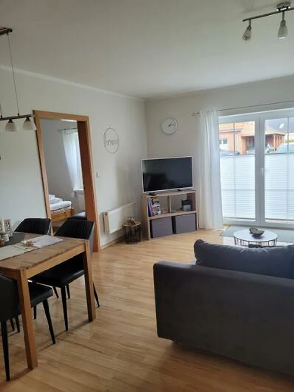 Der Wohn- und Essbereich bietet ein gemütliches Sofa, einen Smart-TV und einen Zugang zur Terrasse. Am Esstisch finden bis zu 4 Personen ausreichend Platz.