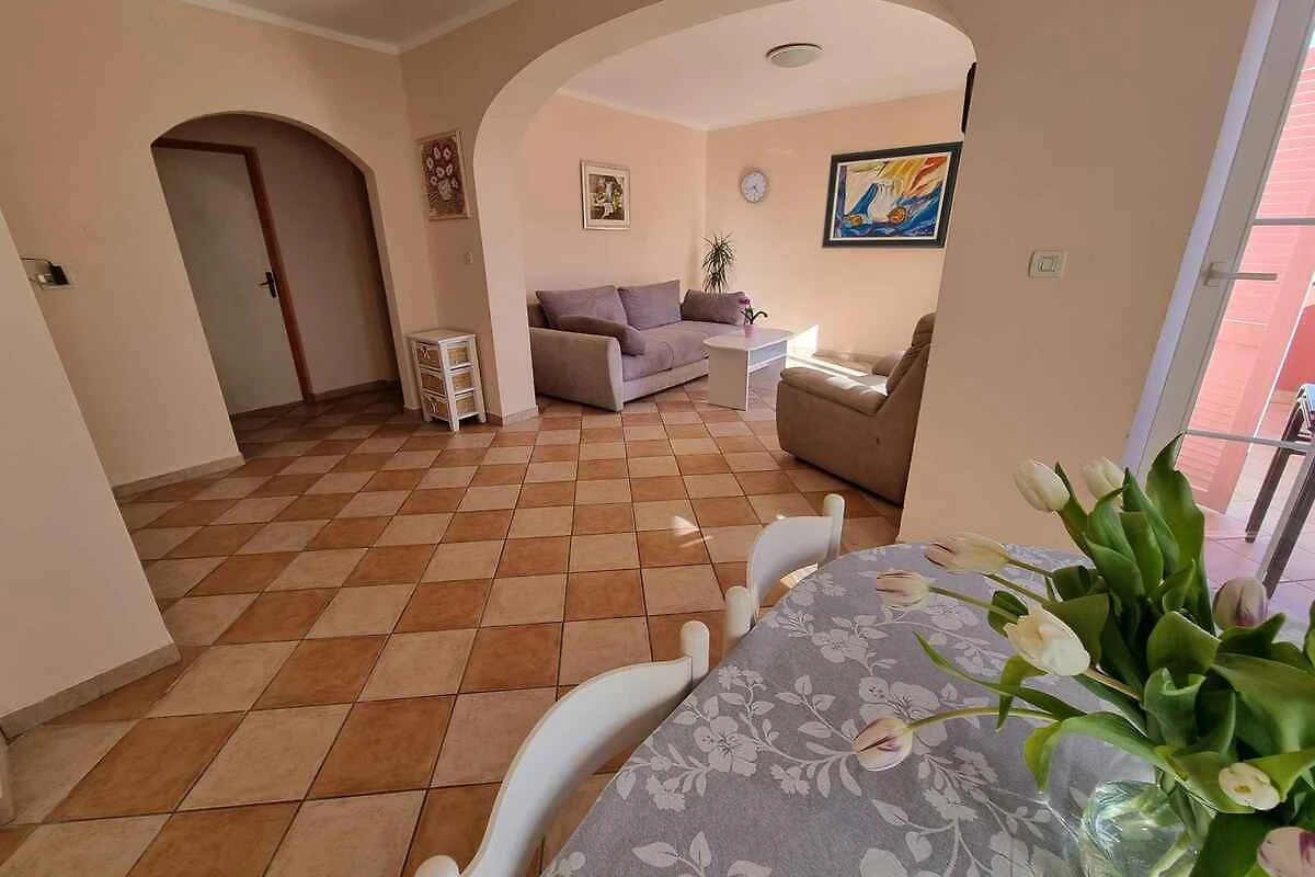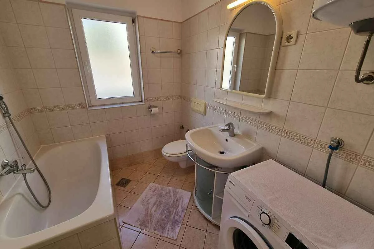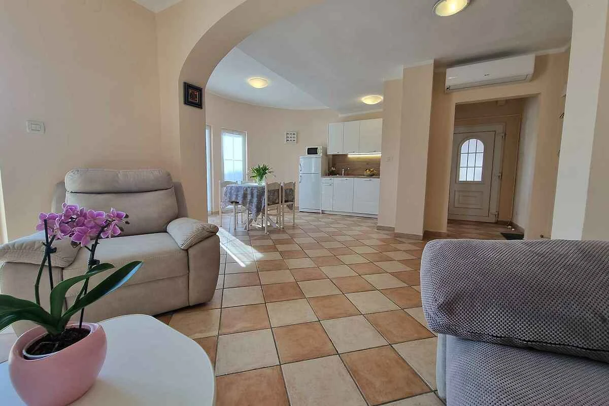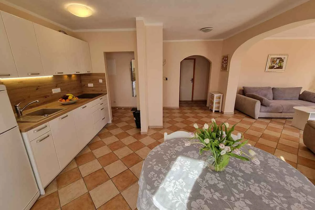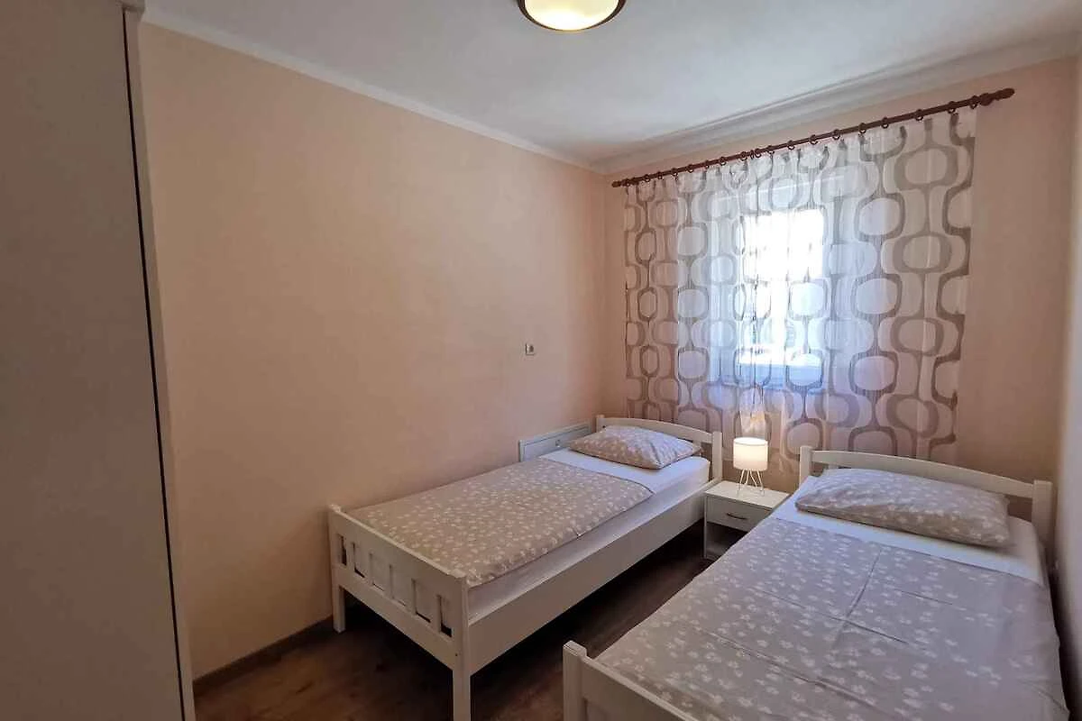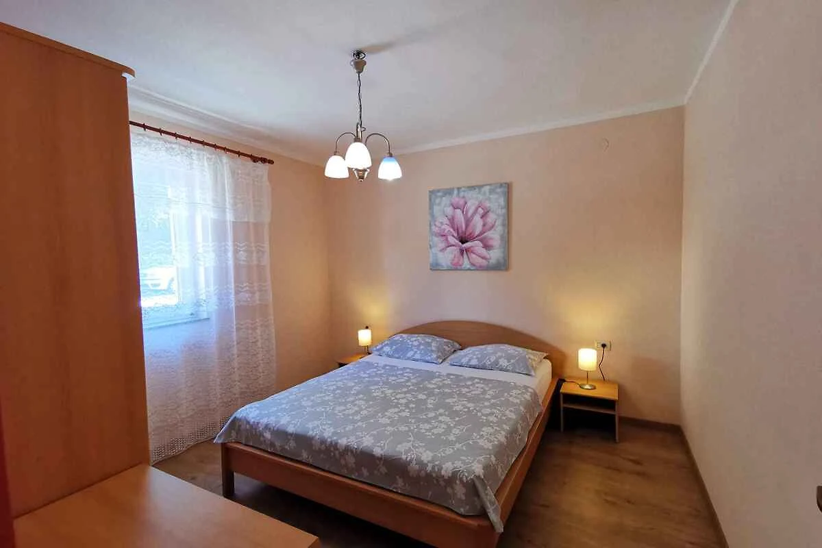 Crikvenica. Die Ferienwohnung befindet sich auf einem offenen Gartengrundstück mit Bäumen. Der Vermieter wohnt nur zeitweise im Haus, nutzt jedoch einen separaten Eingang. Die Zufahrt erfolgt über eine Nebenstrasse (asphaltiert). Parkplatz auf der Strasse vor dem Haus.