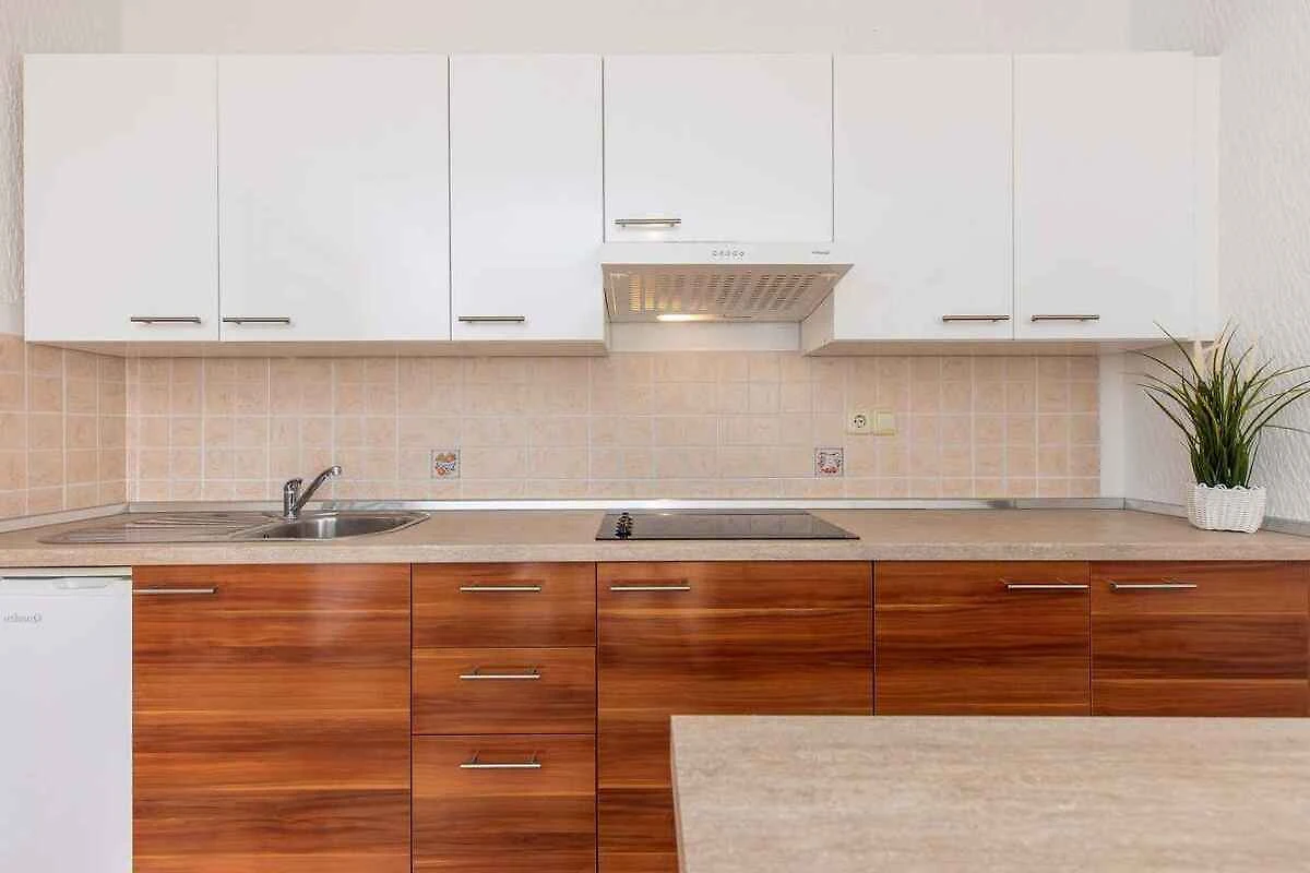 Der Eingang in Ihre Ferienwohnung befindet sich in der 2. Etage und führt über eine Innentreppe direkt in den Flur. Wohn/Schlafzimmer mit 1 Zusatzbett auf Couch/Sofa, TV, Essecke und Zugang zur Terrasse (10 qm, überdacht, Gartenmöbel). Schlafzimmer mit 1 Doppelbett. Kochecke im Wohn/Schlafzimmer mit Elektroherd (Cerankochfeld, 4 Platten), Dunstabzugshaube, Kühlschrank, Mikrowelle, Kaffeemaschine und elektrischem Wasserkocher. Bad mit Waschmaschine, Dusche, 1 Waschbecken, WC, Bidet und Fenster.