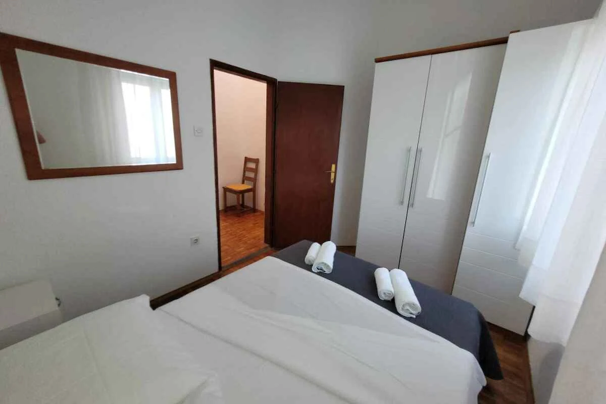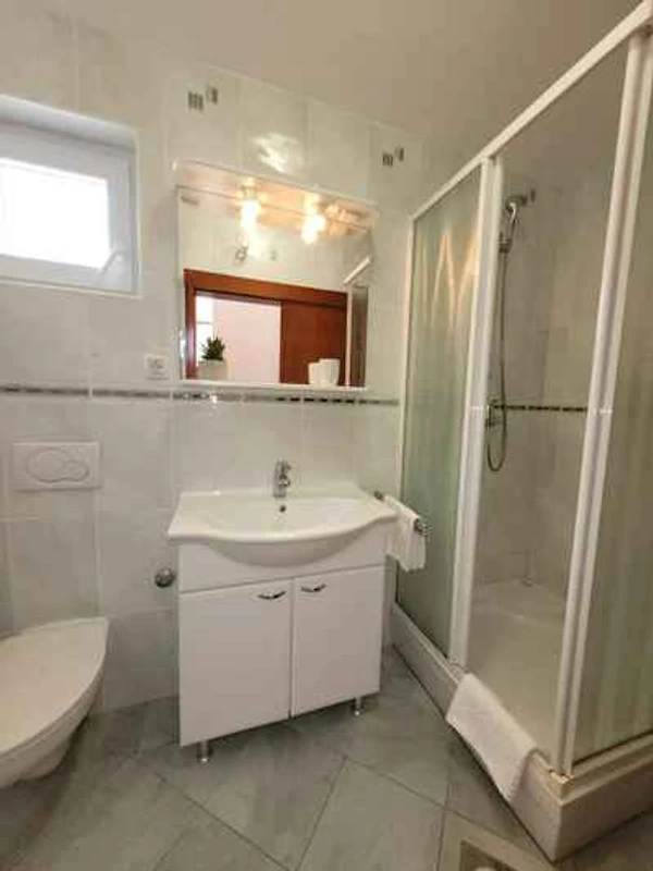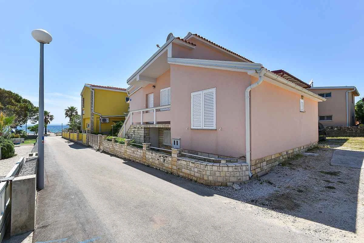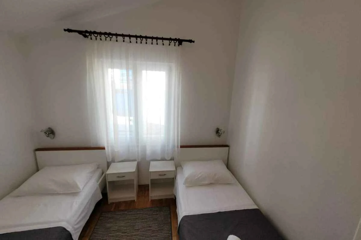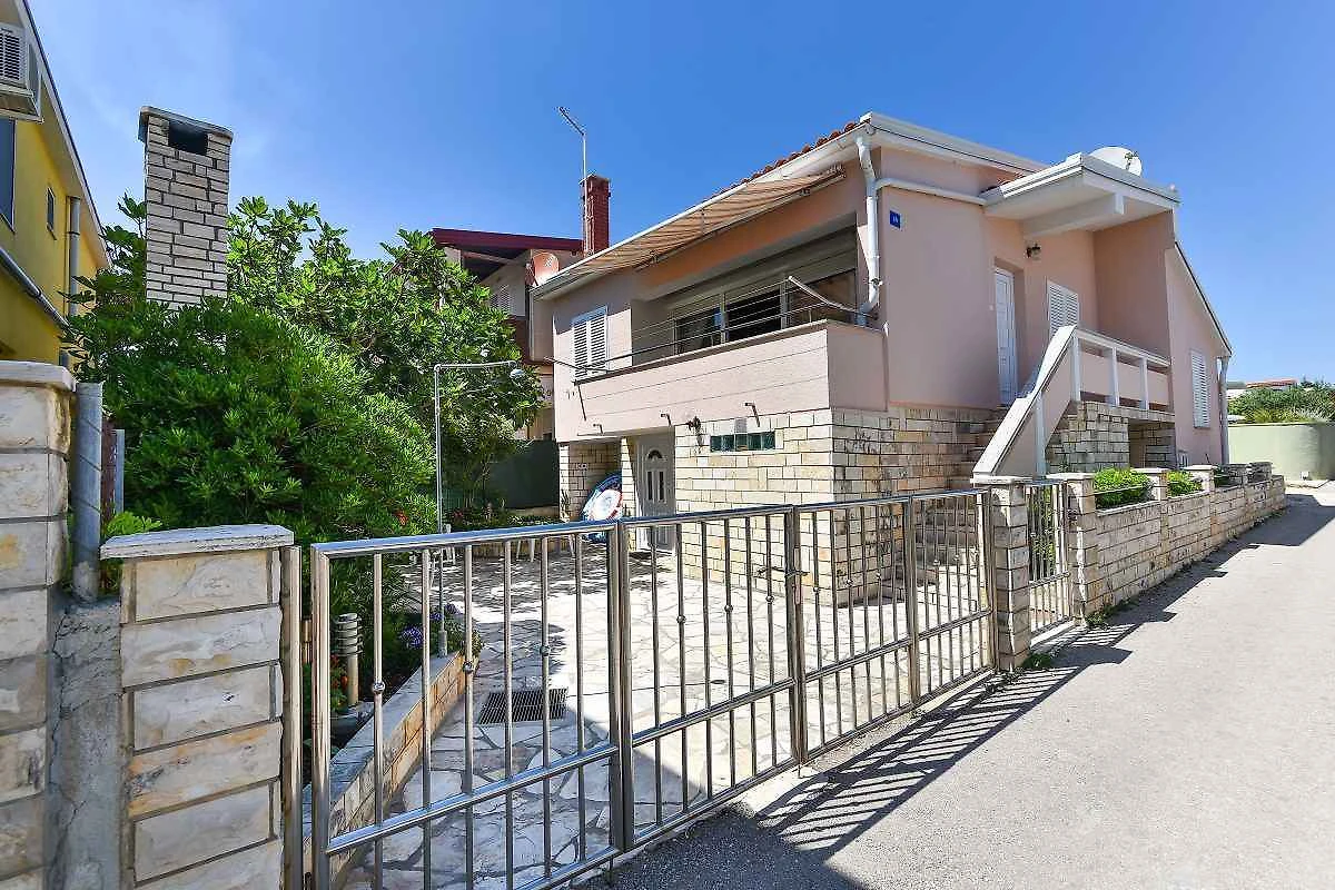 Vir, Ortsteil Miljkovica. Die Ferienwohnung befindet sich auf einem 100 qm grossen, geschlossenen Gartengrundstück mit Blumen und Sträuchern, von einer Mauer begrenzt. Der Vermieter wohnt nur zeitweise im Haus, nutzt jedoch einen separaten Eingang. Die Zufahrt erfolgt über eine Nebenstrasse (asphaltiert). Parkplatz (für 1 Pkw) auf dem Grundstück.