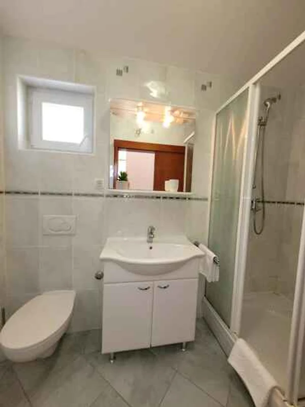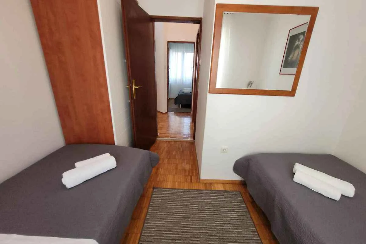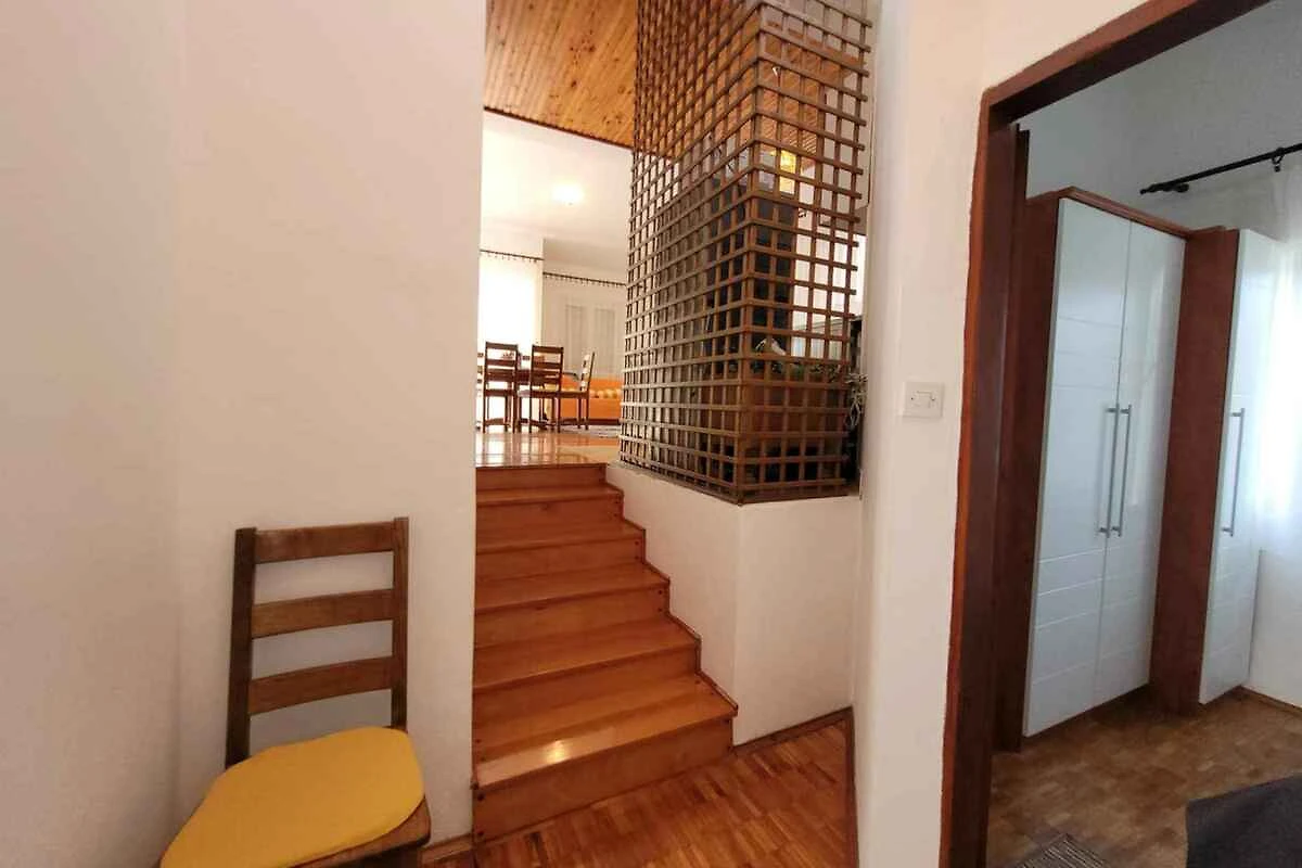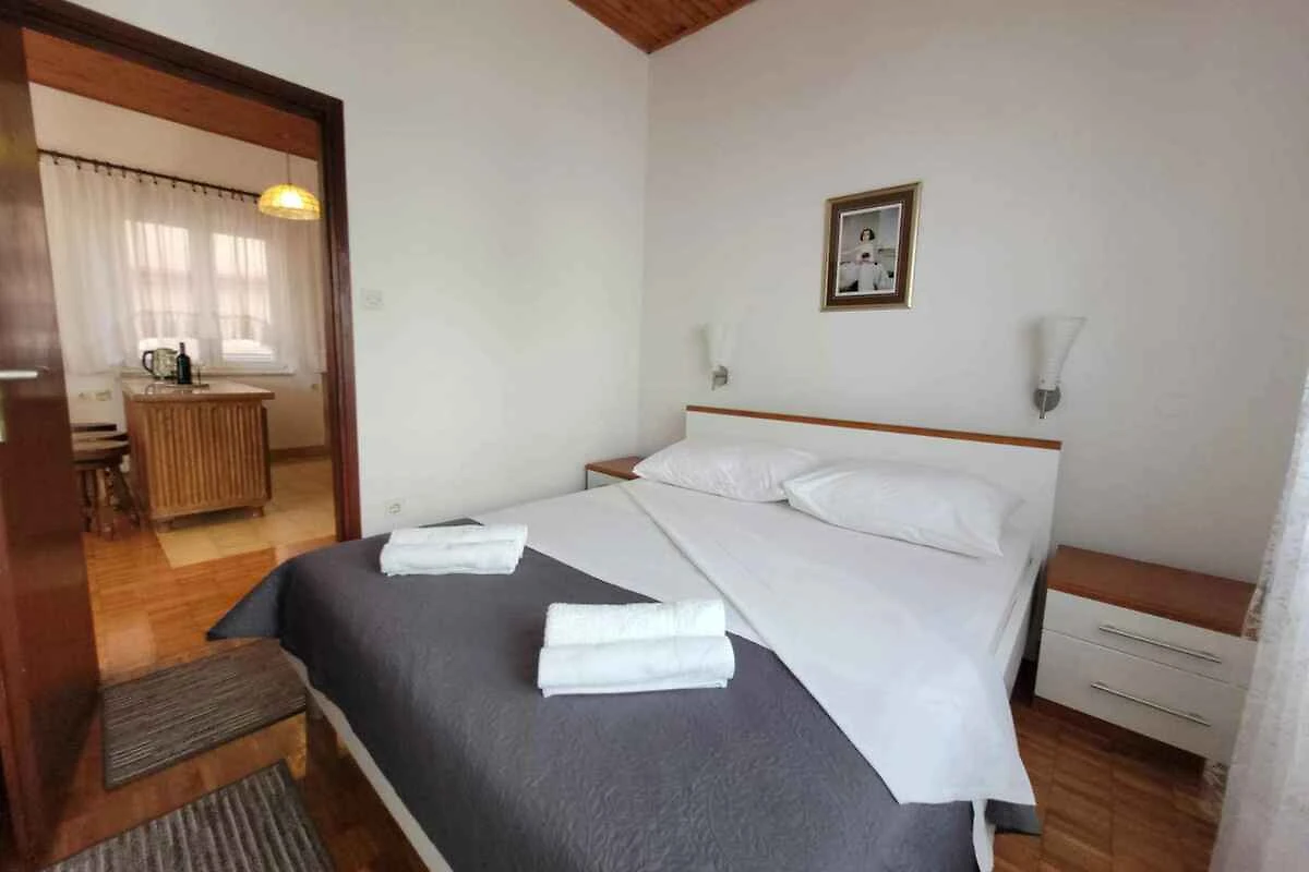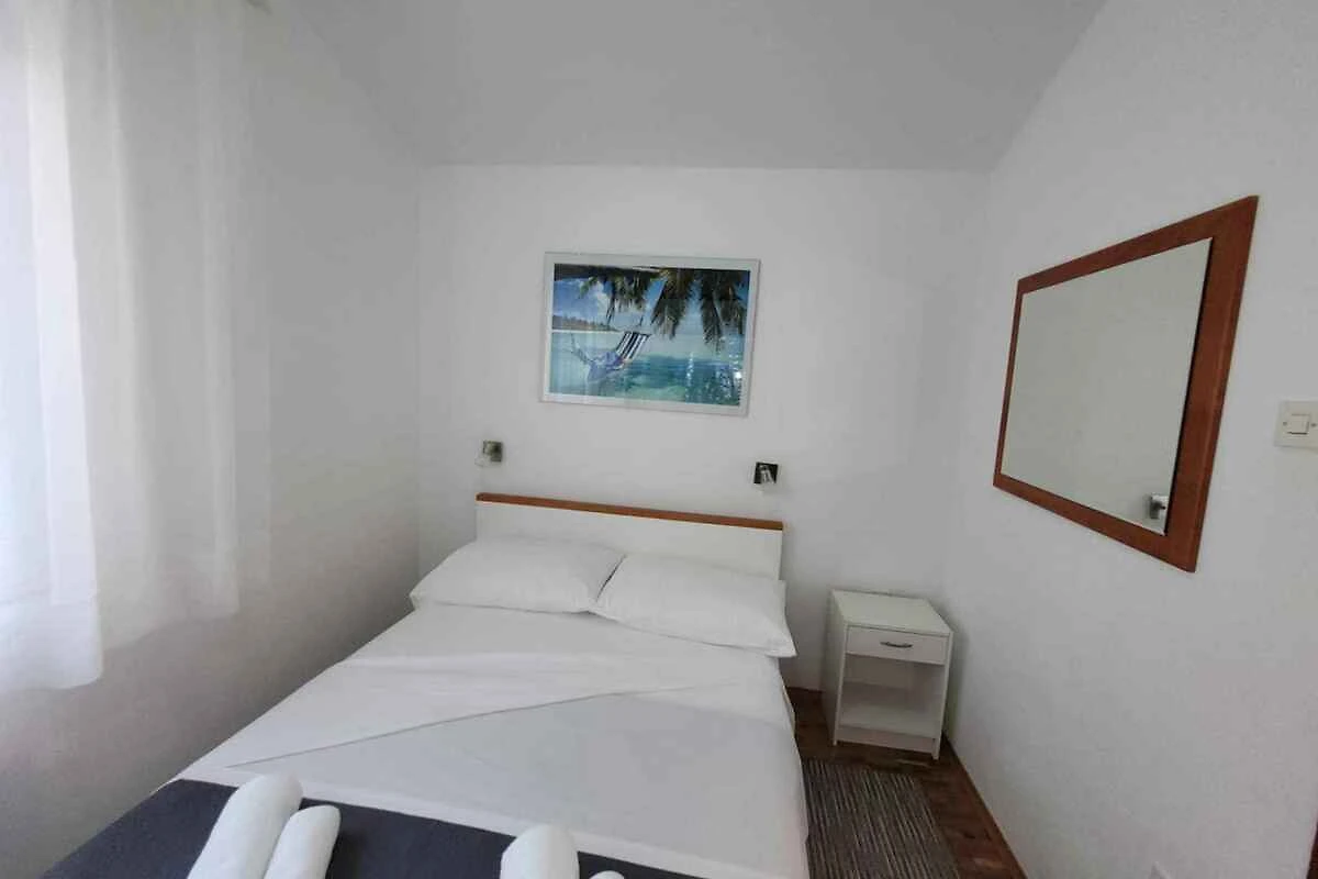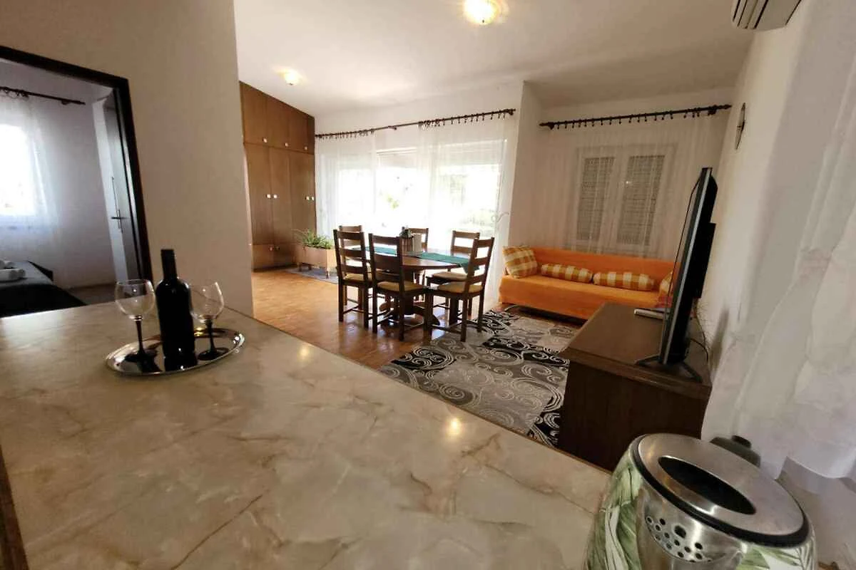 Vir, Ortsteil Miljkovica. Die Ferienwohnung befindet sich auf einem 100 qm grossen, geschlossenen Gartengrundstück mit Blumen und Sträuchern, von einer Mauer begrenzt. Der Vermieter wohnt nur zeitweise im Haus, nutzt jedoch einen separaten Eingang. Die Zufahrt erfolgt über eine Nebenstrasse (asphaltiert). Parkplatz (für 1 Pkw) auf dem Grundstück.