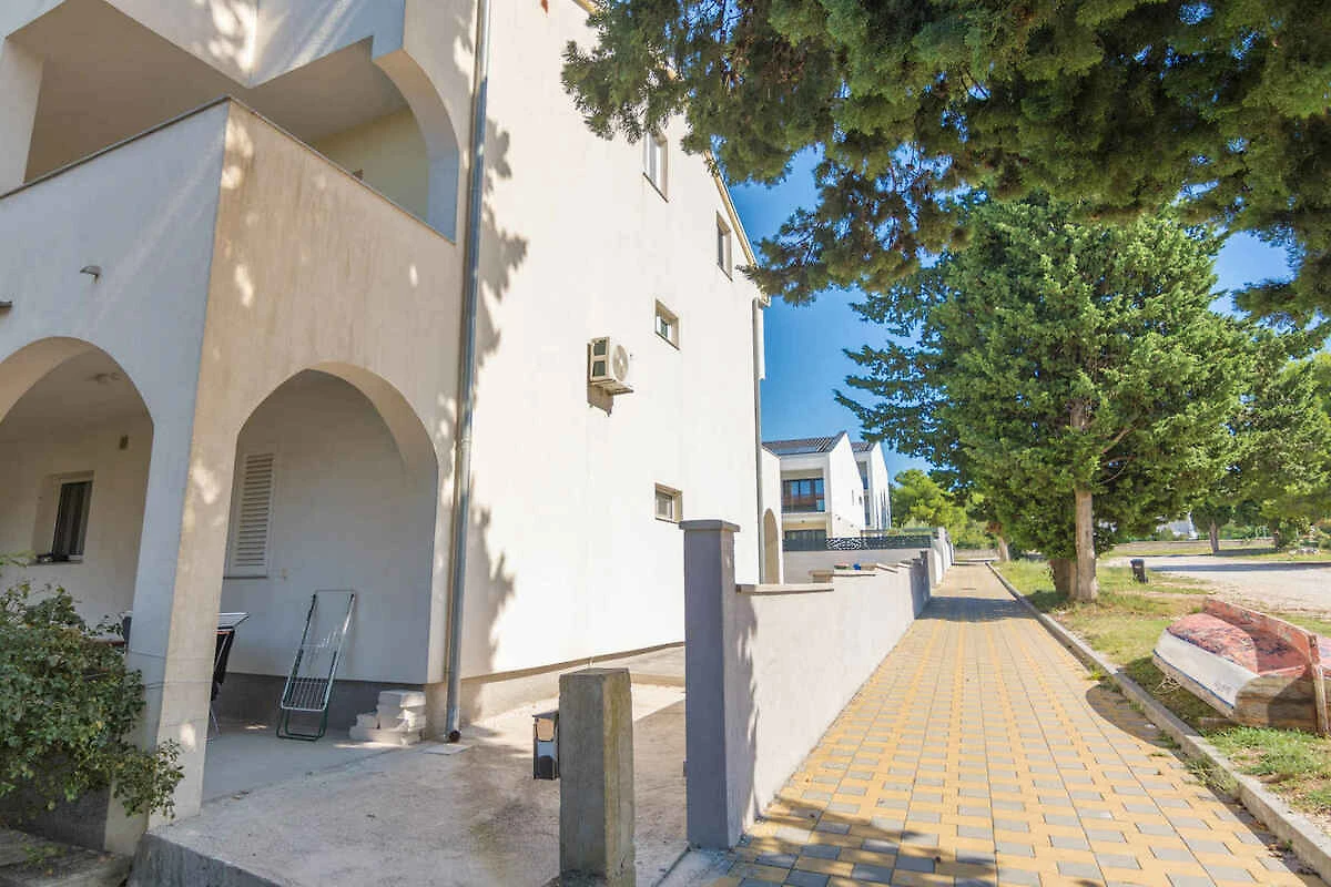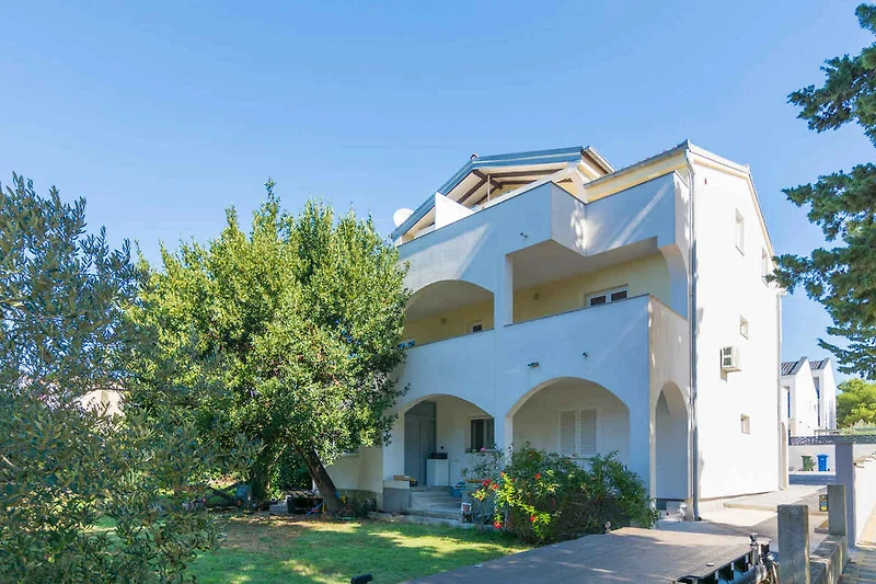 Biograd na Moru. Die Ferienwohnung befindet sich auf einem Gartengrundstück. Die Zufahrt erfolgt über eine Nebenstrasse (asphaltiert). Parkplatz (für 1 Pkw) auf dem Grundstück.