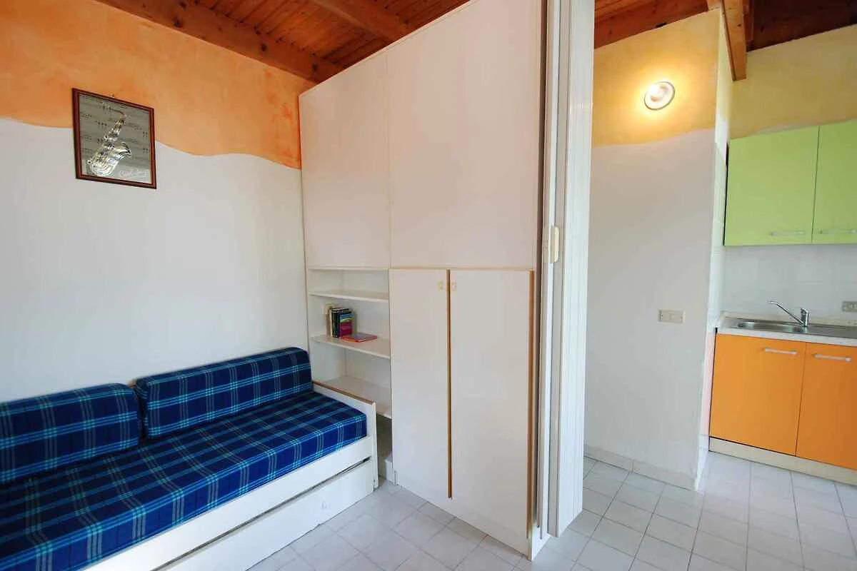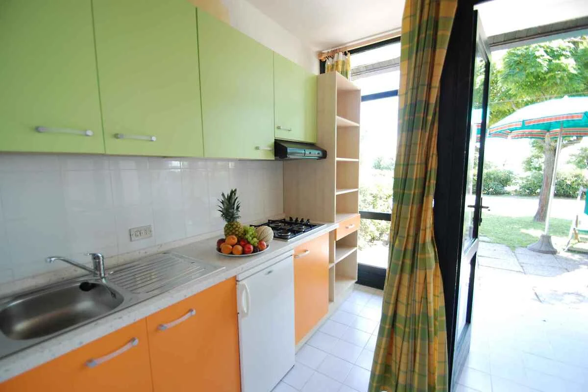 Erdgeschoss: Wohnzimmer mit 2 Zusatzbetten auf Couch/Sofa, TV, Essecke, Zugang zur Terrasse (Gartenmöbel, Sonnenschirm) und das Schlafsofa und das Etagenbett befindet sich im Wohnzimmer leicht abgetrennt von der Küche. Schlafzimmer mit 1 Doppelbett. Kochecke im Wohnzimmer mit Gasherd (4 Flammen), Kühlschrank, Mikrowelle, Kaffeemaschine und bei der Kaffeemaschine handelt es sich um eine Mokkkanne. An der Rezeption kann gegen eine Kaution von 20 € ein Wasserkocher angefordert werden, die dem Kunden bei Rückgabe des Wasserkochers zurückerstattet wird. Bad mit Dusche, 1 Waschbecken und WC.