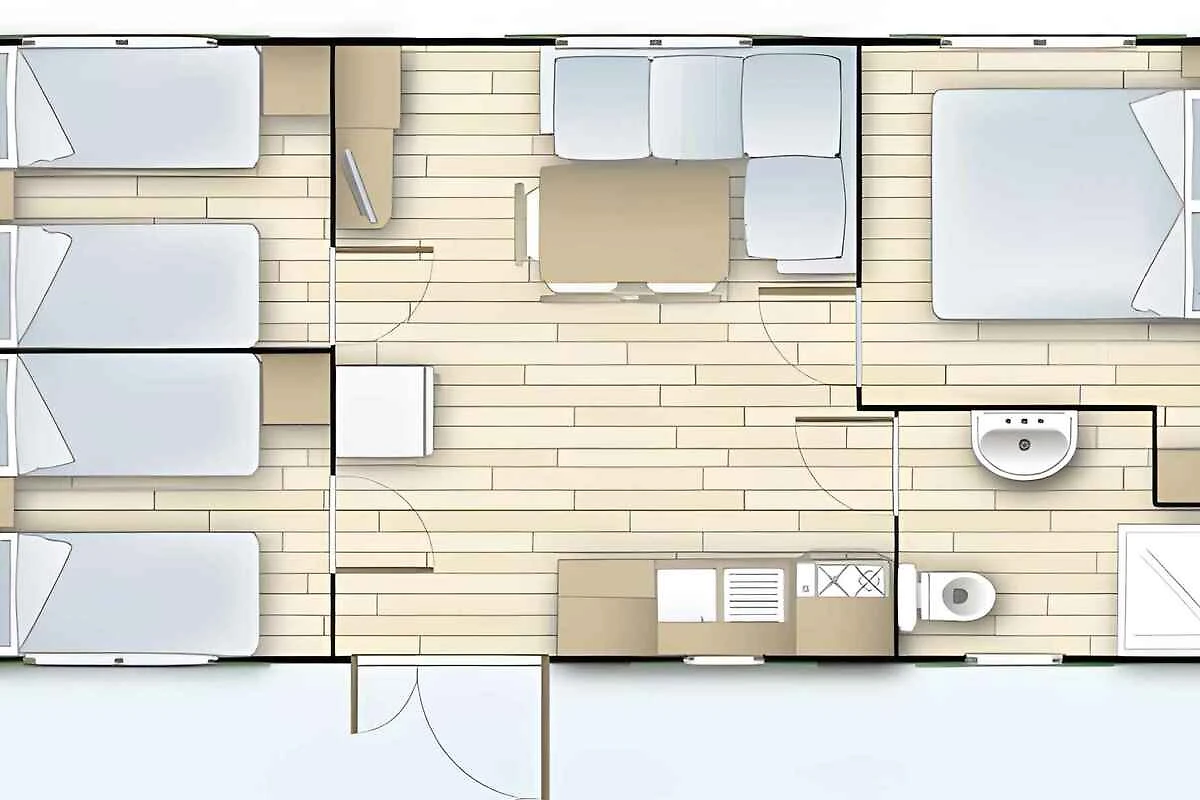 Mobilehome, 1 Etage, 4 Zimmer (davon 3 Schlafzimmer), 32 qm, insgesamt 6 Betten, auf Wunsch zusätzlich 1 Kind bis 2 Jahre im Babybett.