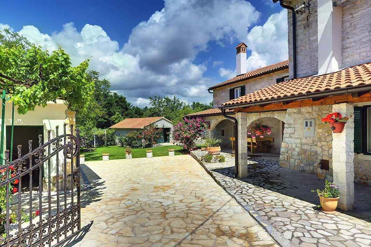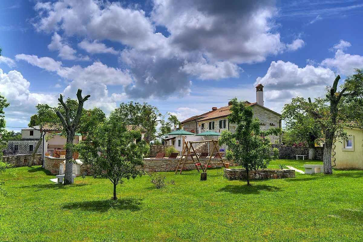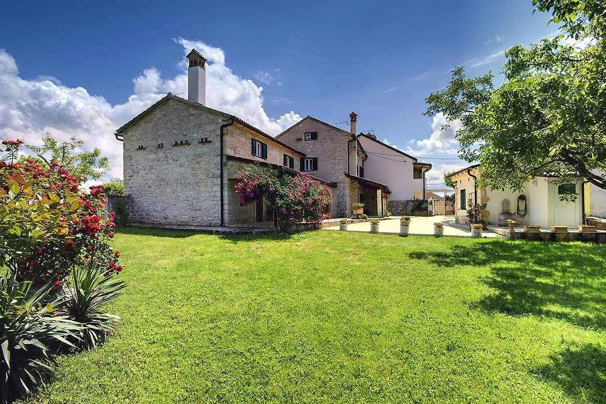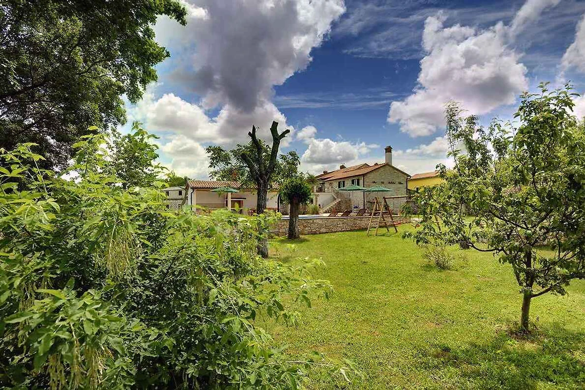 Barban, Ortsteil Rojnići. Die Villa befindet sich auf einem 3700 qm grossen, geschlossenen Gartengrundstück mit Wiese, Blumen, Sträuchern und Bäumen, von einem Zaun und einer Hecke begrenzt. Der Vermieter wohnt nicht im Haus oder auf dem Grundstück. Die Zufahrt erfolgt über eine Nebenstrasse (asphaltiert). Parkplatz (für 3 Pkws) auf dem Grundstück.