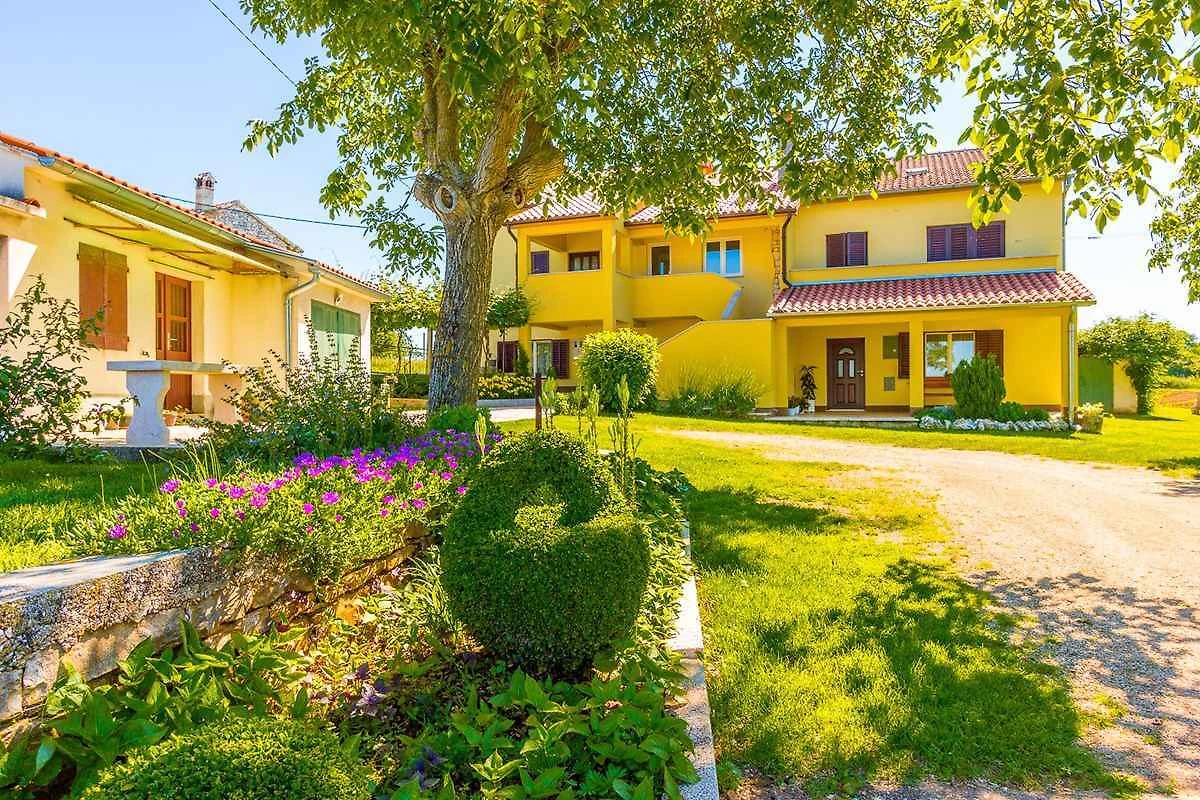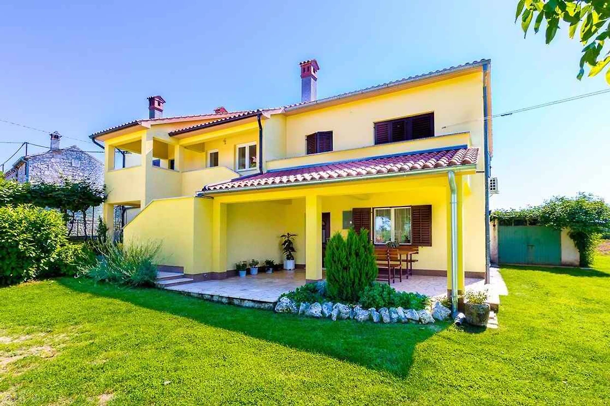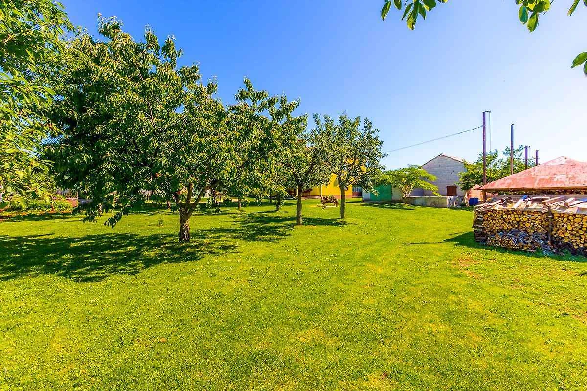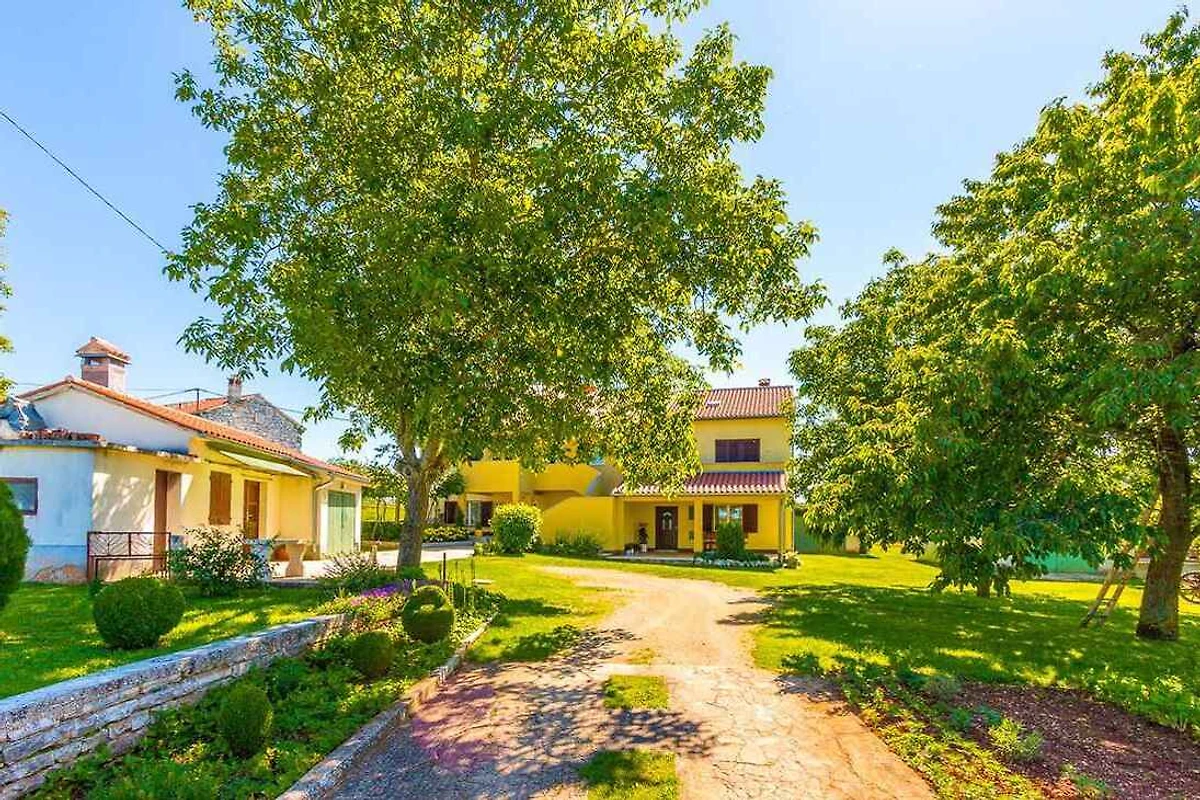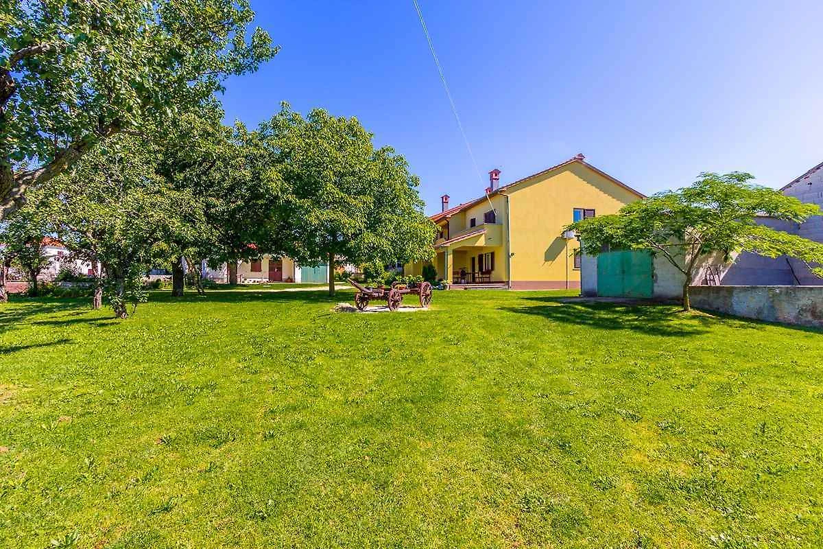 Barban, Ortsteil Grandići. Das Ferienhaus befindet sich auf einem geschlossenen Gartengrundstück. Der Vermieter wohnt ständig im Haus, nutzt jedoch einen separaten Eingang. Doppelhaus. gemeinsamer Garten. Auf fünftausend Quadratmetern erstreckt sich dieses wunderschöne gelbe Ferienhaus in Grandići, in der Umgebung von Barban, das mit einem ländlichen Charme anzieht, wie von aussen so auch von innen. Umgeben von einem einladenden grünen Rasen auf dem stolz ein betagter Kastanien- und Kirschbaum stehen, mit einem alten Zug, dekoriert mit duftenden Töpfen im Hintergrund, ist dieses Ferienhaus perfekt für Familien mit Kindern. Kürzlich renoviert ist das Ferienhaus den modernen Lebensbedingungen angepasst worden und bietet eine gemütliche Privatunterkunft in Istrien für sieben Personen. Die Zufahrt erfolgt über eine Nebenstrasse (asphaltiert). Parkplatz (für 2 Pkws) auf dem Grundstück.