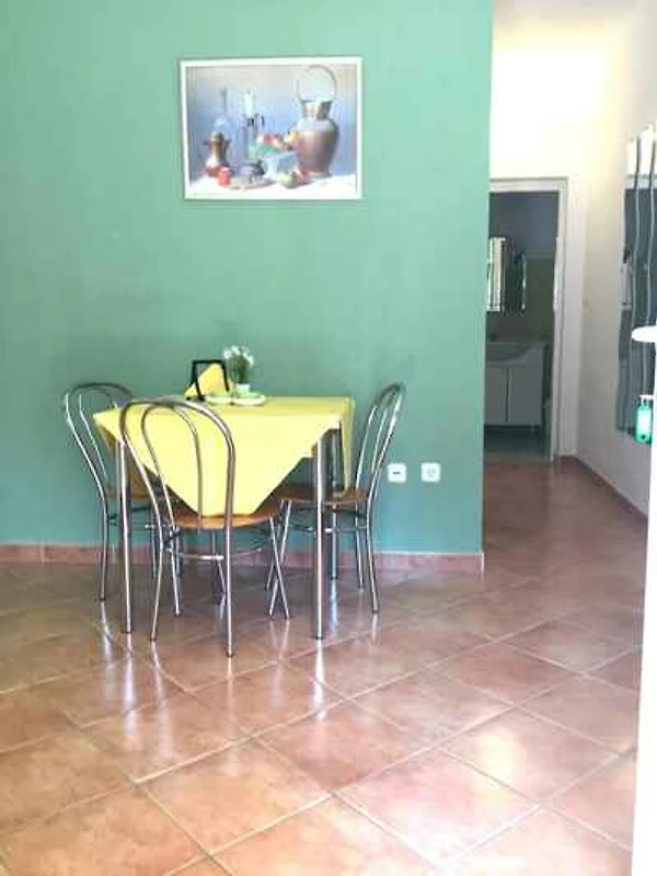 Der Eingang in Ihre Ferienwohnung befindet sich im Erdgeschoss, ist ebenerdig und führt direkt in das Wohn/Schlafzimmer. Schlafzimmer mit 1 Doppelbett, 1 Gitterbett, TV und Babybett auf Wunsch gegen Gebühr vor Ort. Küche mit Essecke (2 Plätze), Gasherd (3 Flammen), Elektroherd (1 Platte), Dunstabzugshaube, Kühlschrank, Mikrowelle, Kaffeemaschine und Zugang zur Terrasse. Bad mit Dusche, 1 Waschbecken, WC, Bidet und Fenster.