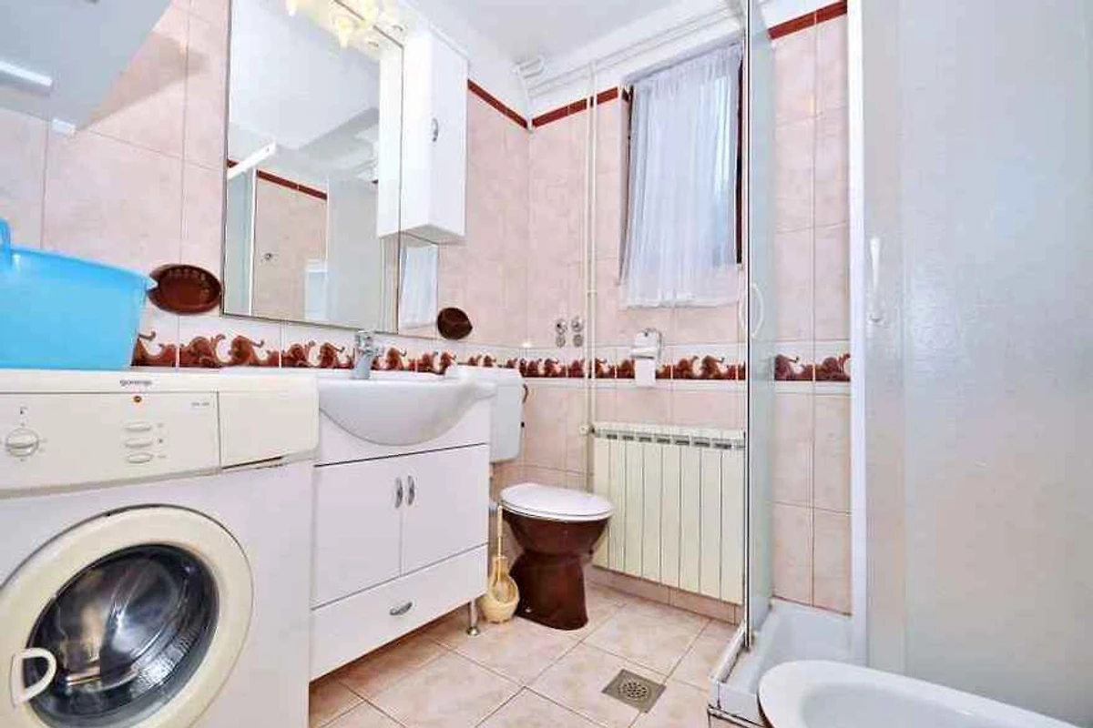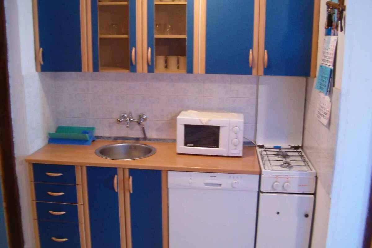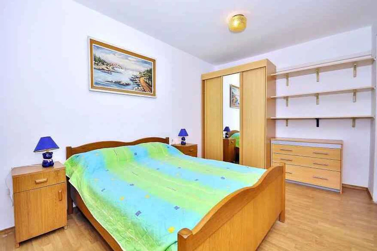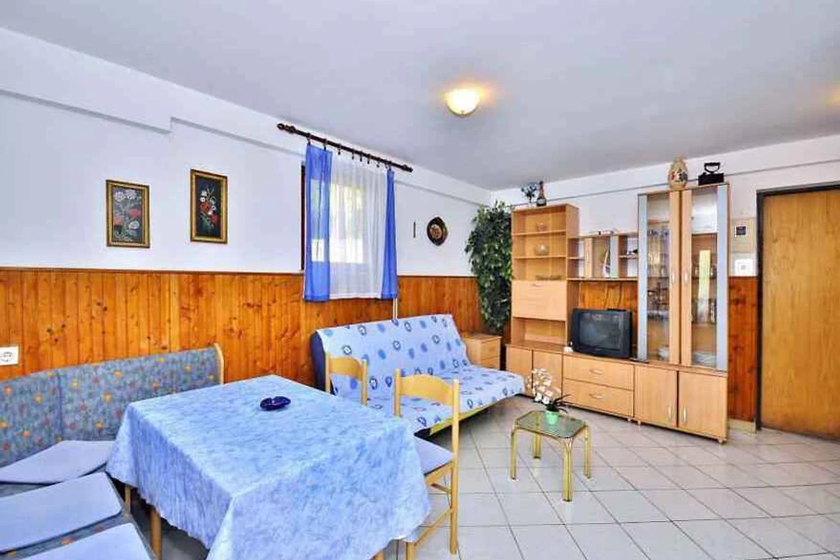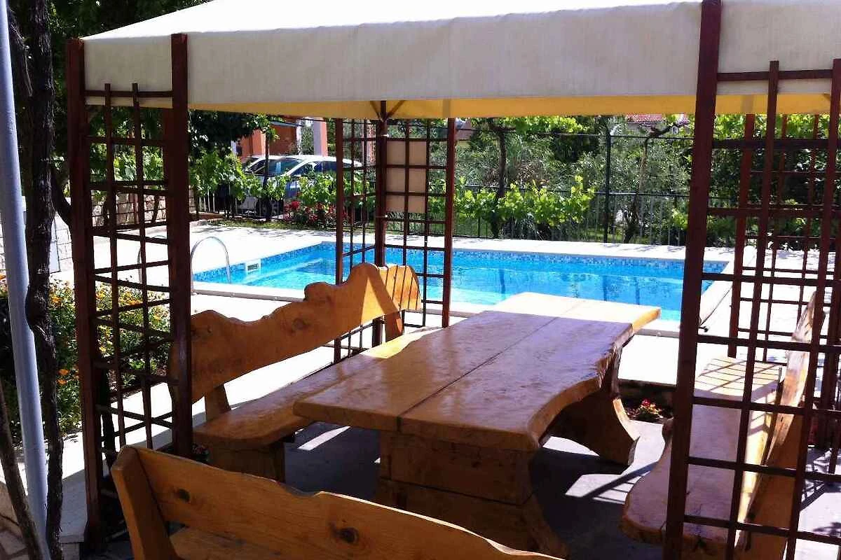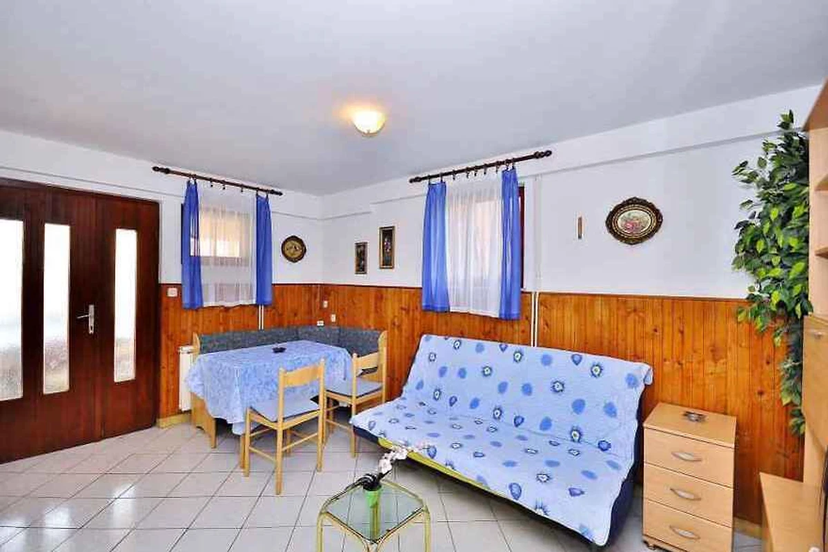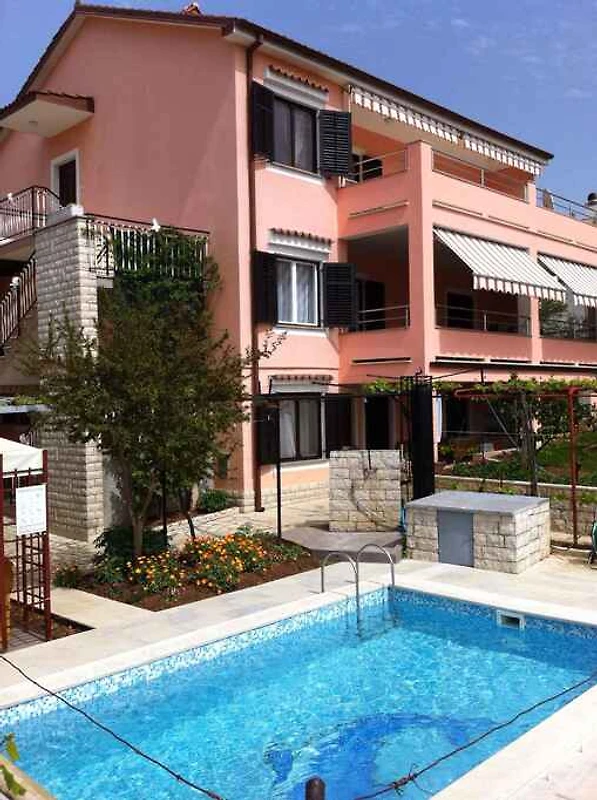 Pula, Ortsteil Veli Vrh, 30 mNN. Die Ferienwohnung befindet sich auf einem 760 qm grossen, geschlossenen Gartengrundstück mit Wiese, Blumen, Sträuchern und Bäumen, von einem Zaun begrenzt. Der Vermieter wohnt ständig im Haus, nutzt jedoch einen separaten Eingang. Die Zufahrt erfolgt über eine Nebenstrasse (asphaltiert). Parkplatz (für 1 Pkw) auf dem Grundstück und der Strasse vor dem Haus.