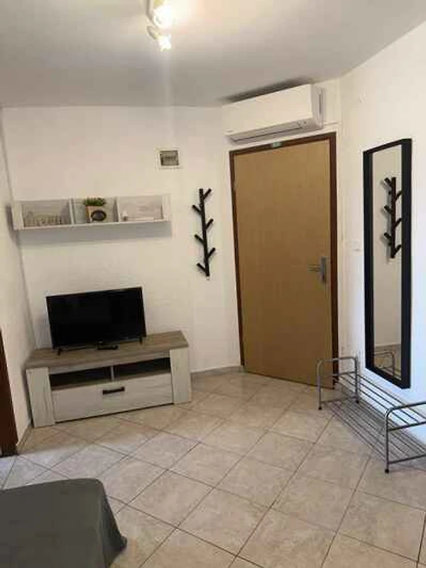 und führt direkt in den Flur. Wohnküche mit 1 Zusatzbett auf Couch/Sofa und TV. Schlafzimmer mit 1 Doppelbett und Zugang zum Balkon (6 qm). Kochecke in der Wohnküche mit Klimaanlage, Essecke, Gasherd (2 Flammen), Kühlschrank (80 l, Eisfach), Kaffeemaschine und elektrischem Wasserkocher. Bad mit Dusche, 1 Waschbecken, WC und Fenster.