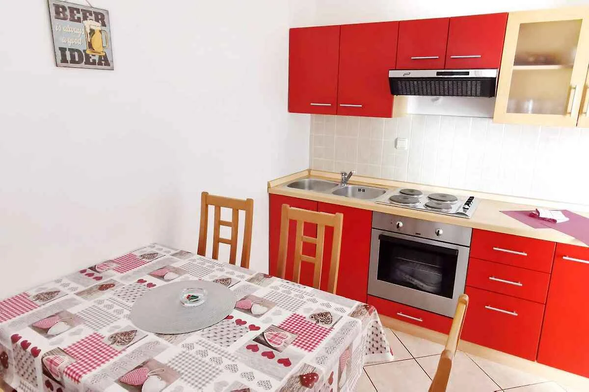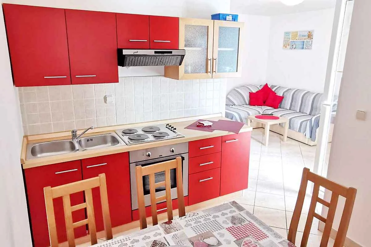 Der Eingang in Ihre Ferienwohnung befindet sich im Erdgeschoss. Wohnküche mit 1 Zusatzbett auf Couch/Sofa, Sitzecke, TV, Essecke (5 Plätze) und Zugang zur Terrasse. Schlafzimmer mit 2 Einzelbetten. Schlafzimmer mit 1 Doppelbett. Kochnische in der Wohnküche mit Essecke (5 Plätze), Elektroherd, Backofen, Kühlschrank (Eisfach), Kaffeemaschine und Zugang zur Terrasse. Bad mit Dusche, 1 Waschbecken, WC und Bidet.