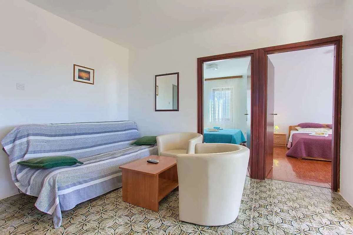Krk. Die Ferienwohnung befindet sich auf einem 300 qm grossen, geschlossenen Gartengrundstück mit Blumen und Bäumen, von einem Zaun begrenzt. Der Vermieter wohnt ständig im Haus, nutzt jedoch einen separaten Eingang. Die Zufahrt erfolgt über eine Nebenstrasse (asphaltiert). Parkplatz (für 1 Pkw) auf dem Grundstück.