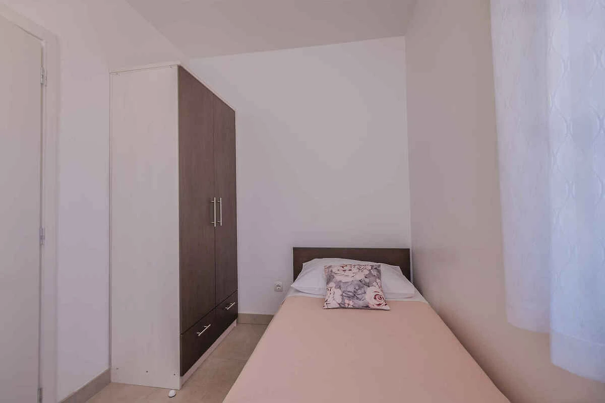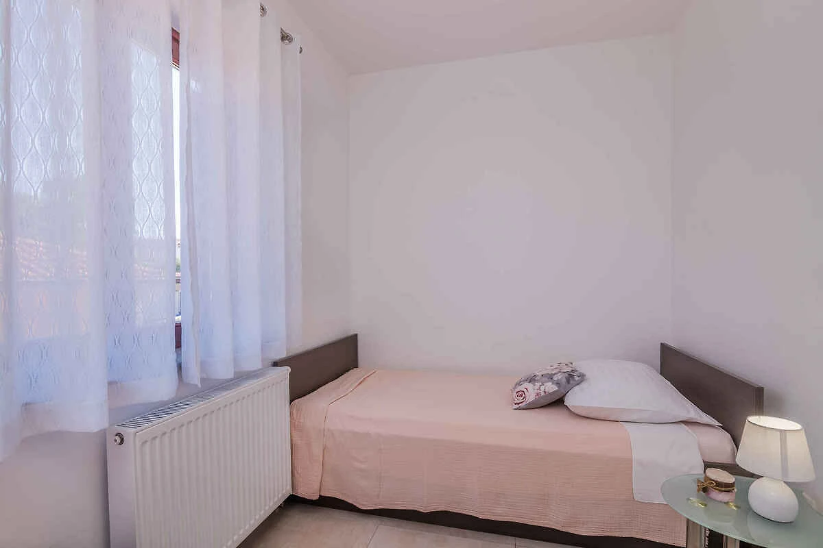 Der Eingang in Ihre Ferienwohnung führt direkt in den Flur. Wohnzimmer (20 qm, nicht beheizbar) mit 1 Zusatzbett auf Couch/Sofa, TV, Essecke (5 Plätze) und Zugang zum Balkon (10 qm, überdacht, 1 Tisch, 5 Stühle). Schlafzimmer (10 qm, nicht beheizbar) mit 2 Einzelbetten. Schlafzimmer (10 qm, nicht beheizbar) mit 1 Doppelbett. Küche im Wohnzimmer (5 qm) mit Elektroherd (4 Platten), Backofen, Kühlschrank und Kaffeemaschine. Bad (10 qm, nicht beheizbar) mit Dusche, 1 Waschbecken und WC.