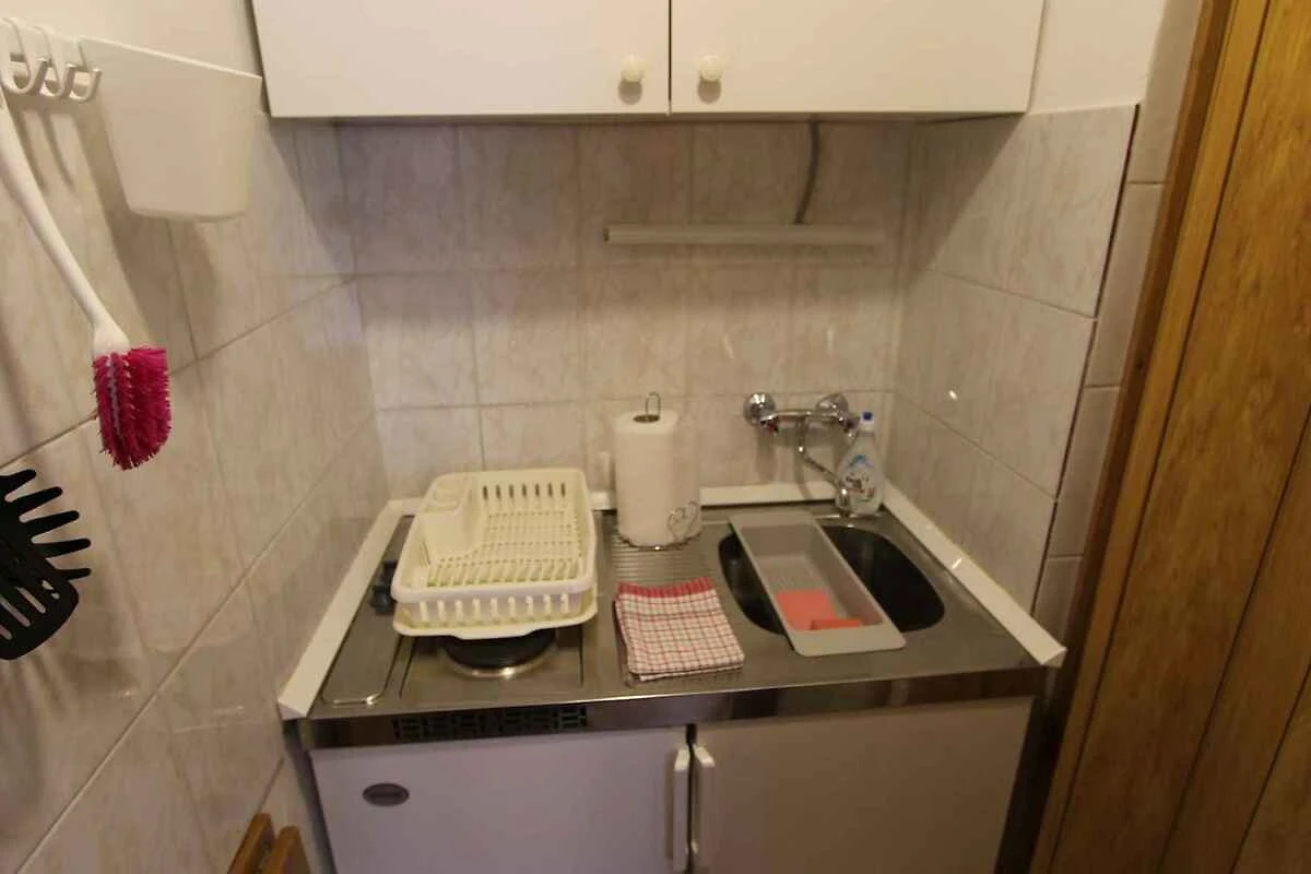 Malinska, Ortsteil Vantačići. Das Studio befindet sich auf einem geschlossenen Gartengrundstück mit Blumen und Bäumen, von einem Zaun begrenzt. Der Vermieter wohnt ständig im Haus, nutzt jedoch einen separaten Eingang. Die Zufahrt erfolgt über einen Weg (asphaltiert). Parkplatz (für 1 Pkw) auf dem Grundstück.