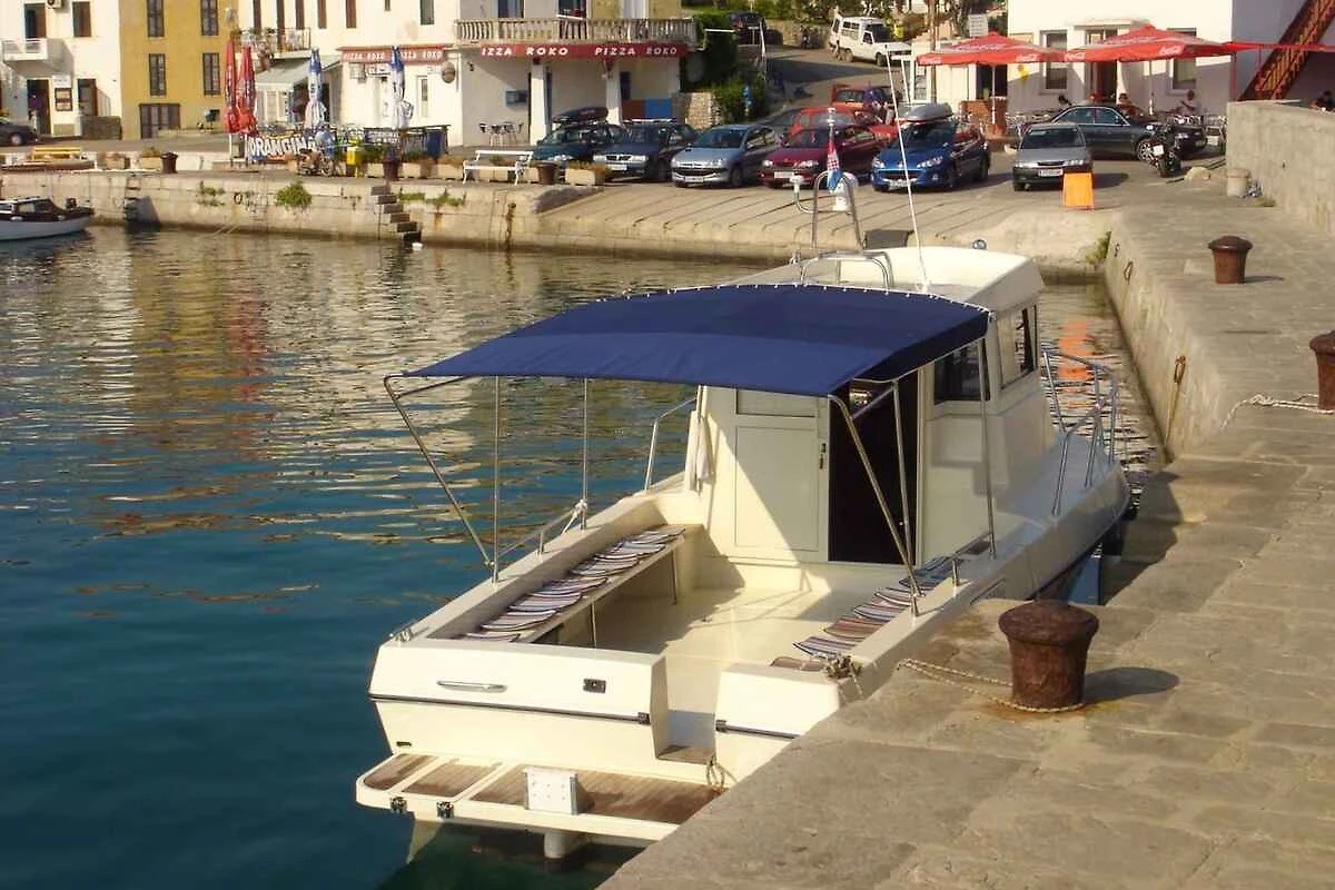 Šilo, Ortsteil Polje. Die Ferienwohnung befindet sich auf einem geschlossenen Gartengrundstück mit Wiese, Blumen und Bäumen, von einem Zaun begrenzt. Der Vermieter wohnt ständig im Haus, nutzt jedoch einen separaten Eingang. Die Zufahrt erfolgt über eine Nebenstrasse. Parkplatz (für 2 Pkws) auf dem Grundstück.