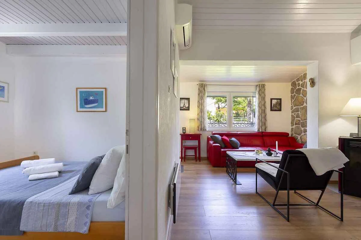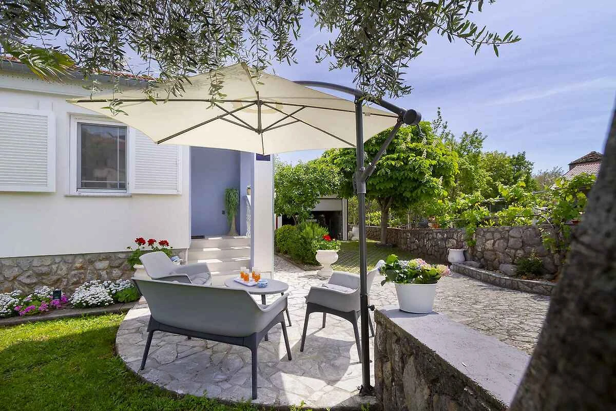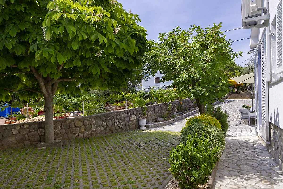 Šilo, Ortsteil Polje. Die Ferienwohnung befindet sich auf einem geschlossenen Gartengrundstück mit Wiese, Blumen und Bäumen, von einem Zaun begrenzt. Der Vermieter wohnt nicht im Haus oder auf dem Grundstück. Die Zufahrt erfolgt direkt von der Hauptstrasse. Parkplatz (für 1 Pkw) auf dem Grundstück.