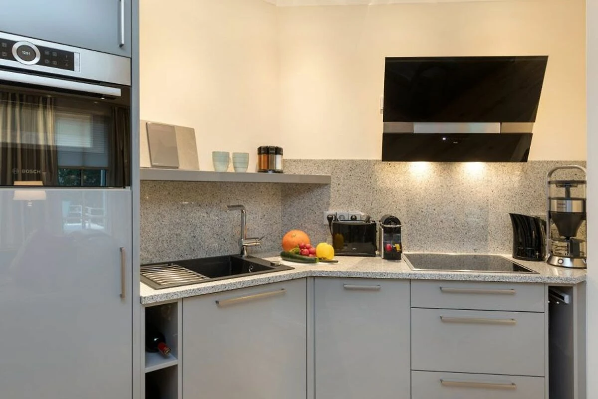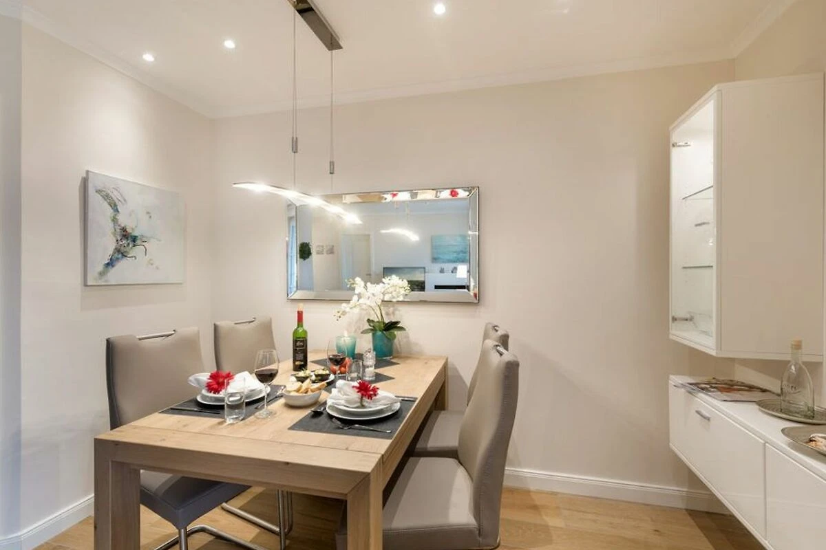 • Küche und Essbereich: Offene, voll ausgestattete Küche mit Granit-Arbeitsplatte, Ceran-Kochfeld, Backofen mit integrierter Mikrowelle, Geschirrspüler, Kühlschrank mit Gefrierfach, Nespresso-Maschine, Filterkaffeemaschine, Toaster und Wasserkocher. Die angrenzende Essgruppe lädt zu geselligen Mahlzeiten ein.