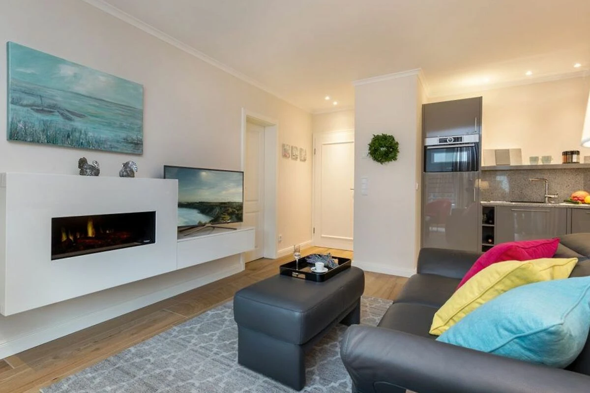 • Wohnbereich: Heller Wohnraum mit bequemer Sitzgruppe, elektrischem Kamin, Flachbild-TV und Zugang zum Balkon für entspannte Stunden.