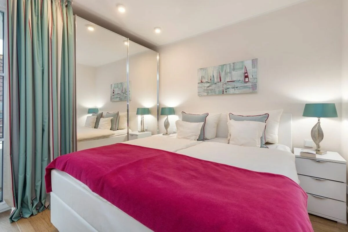 • Schlafzimmer: Gemütliches Schlafzimmer mit komfortablem Boxspringbett (180 x 200 cm) und grossem, spiegelverkleidetem Schrank für erholsame Nächte.