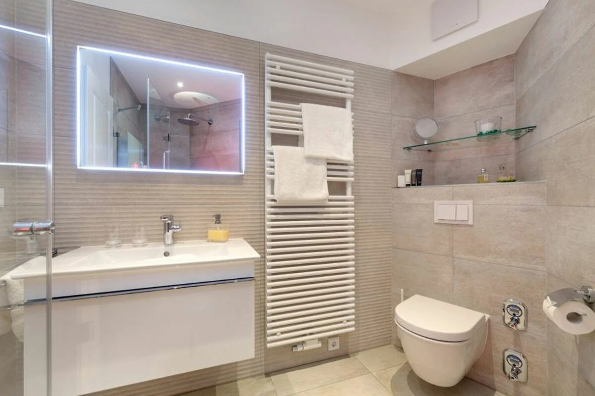 • Badezimmer: Modernes Bad mit bodengleicher Duschkabine und Infrarot-Dusche von Physiotherm für zusätzlichen Komfort.