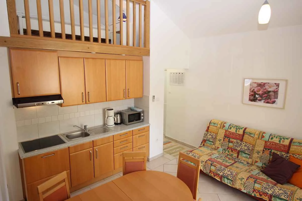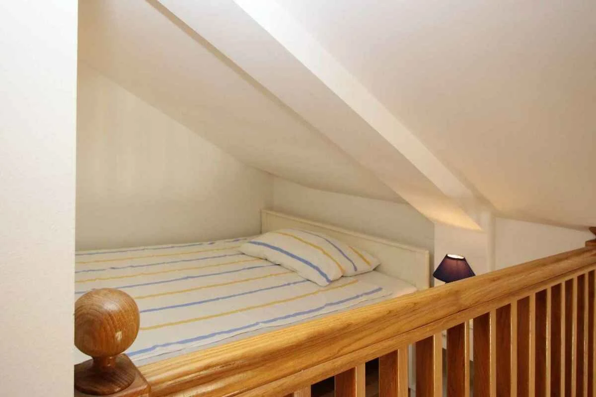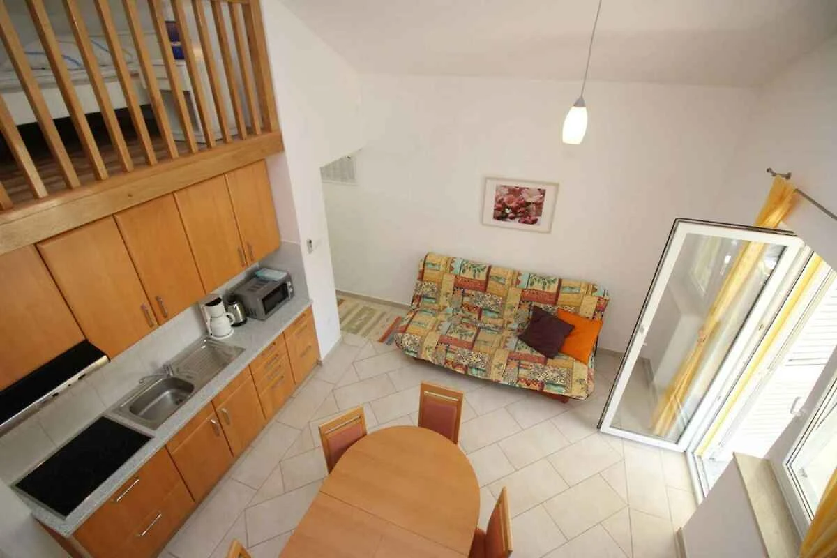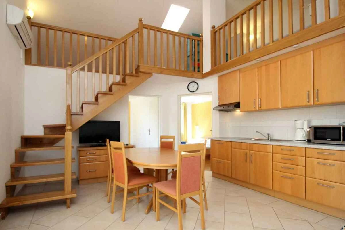 . Wohnküche mit TV, Essecke und Zugang zum Balkon. 2 Schlafzimmer jeweils mit 1 Doppelbett. Kochnische in der Wohnküche mit TV, Essecke, Elektroherd, Kühlschrank (Eisfach), Mikrowelle, Kaffeemaschine, elektrischem Wasserkocher und Zugang zum Balkon. Bad mit Dusche, 1 Waschbecken und WC. Schlafzimmer mit 1 Doppelbett und the bed is on a sleeping gallery.