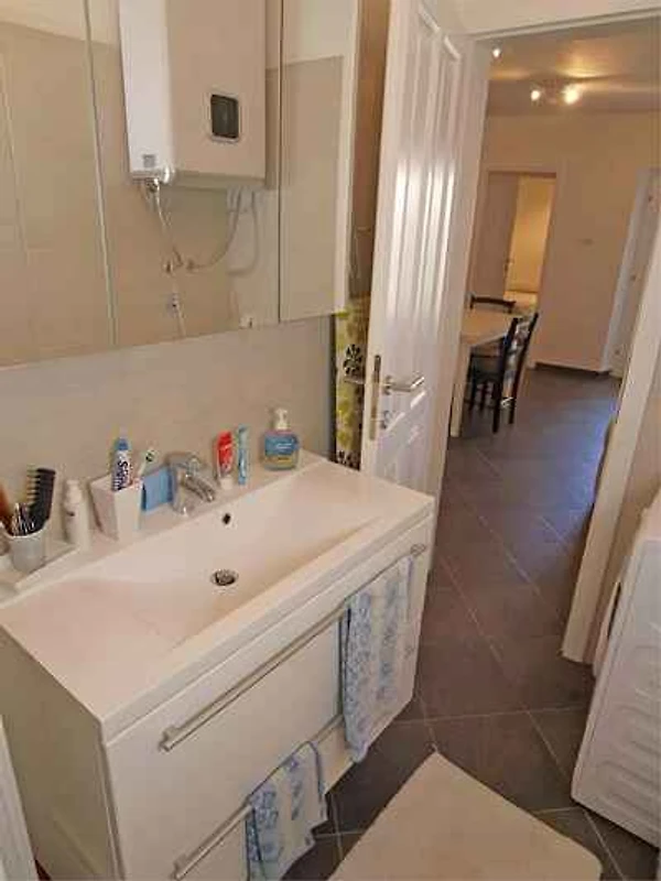 Der Eingang in Ihre Ferienwohnung befindet sich im Erdgeschoss. Wohnzimmer mit Sitzecke, TV, Klimaanlage, Essecke (3 Plätze) und Zugang zur Terrasse. Schlafzimmer mit 1 Einzelbett und TV. Schlafzimmer mit 1 Doppelbett und Zugang zur Terrasse. Kochecke im Wohnzimmer mit Klimaanlage, Essecke, Elektroherd (Induktionsherd), Dunstabzugshaube, Kühlschrank und Mikrowelle. Bad mit mit Duscheinrichtung, Waschmaschine, 1 Waschbecken und WC.